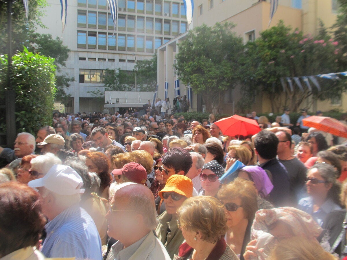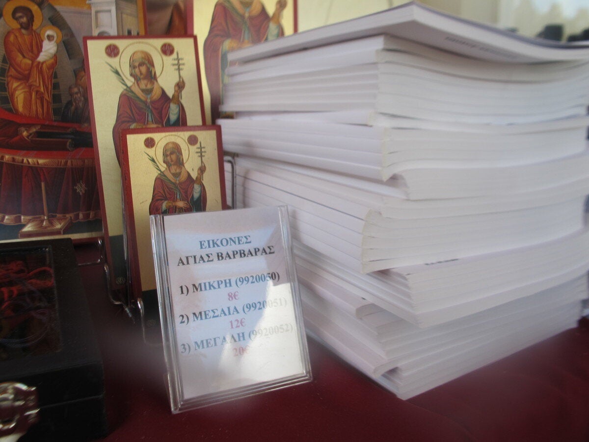 Ένας δυο μικροπωλητές παρομοίων ειδών, δύο μοτοσυκλετιστές της ΕΛ.ΑΣ. για την επικείμενη μεταφορά του σκηνώματος, λίγοι υπάλληλοι ιδιωτικής εταιρείας security και κάποιες δεκάδες πιστοί. Μια γυναίκα ακουμπά ευλαβικά το χέρι της σε μια αφίσα έξω από το ναό και κάνει το σταυρό της.