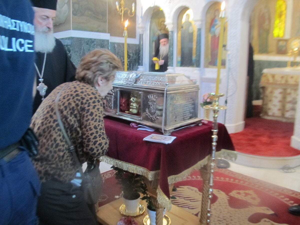 Εγκαταλείπω τις προσπάθειες να εισέλθω στο ναό, όπου πλέον έχει ξεκινήσει το προσκύνημα της αγίας κάρας, από την κύρια είσοδο. Και ακολουθώ την ελληνική (και δημοσιογραφική) πεπατημένη, αυτήν της πλαγίας οδού, ή μάλλον εισόδου. Δεν είμαι ο μόνος που το έχει όμως σκεφτεί… Δεκάδες πιστοί προσπαθούν το ίδιο «τρυκ». Μια γυναίκα λιποθυμάει μπροστά από το σκήνωμα της Αγίας, μια δεύτερη από την εξάντληση (ή και τη συγκίνηση) αμέσως μετά τα πρώτα της βήματα μέσα στην εκκλησία.