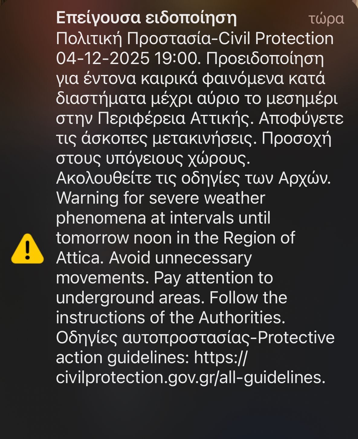 «Προειδοποίηση για έντονα καιρικά φαινόμενα κατά διαστήματα μέχρι αύριο το μεσημέρι στην Περιφέρεια Αττικής. Αποφύγετε τις άσκοπες μετακινήσεις. Προσοχή στους υπόγειους χώρους. Ακολουθείτε τις οδηγίες των Αρχών».