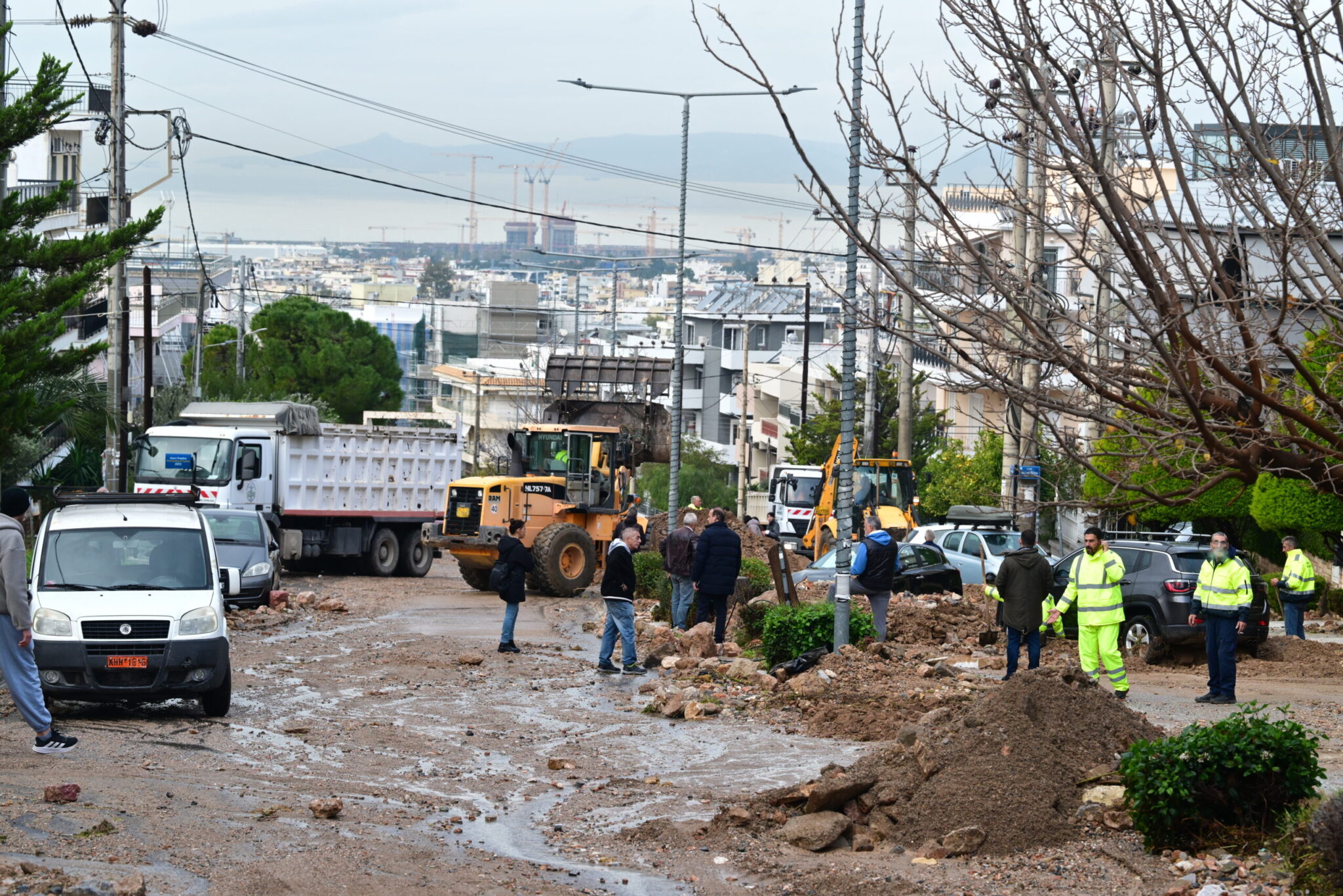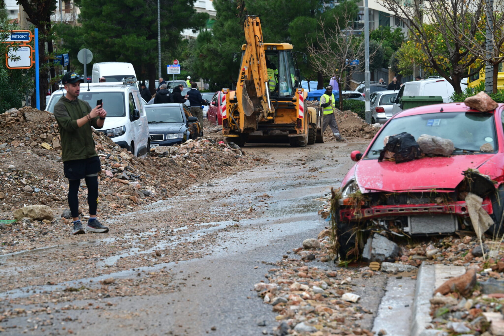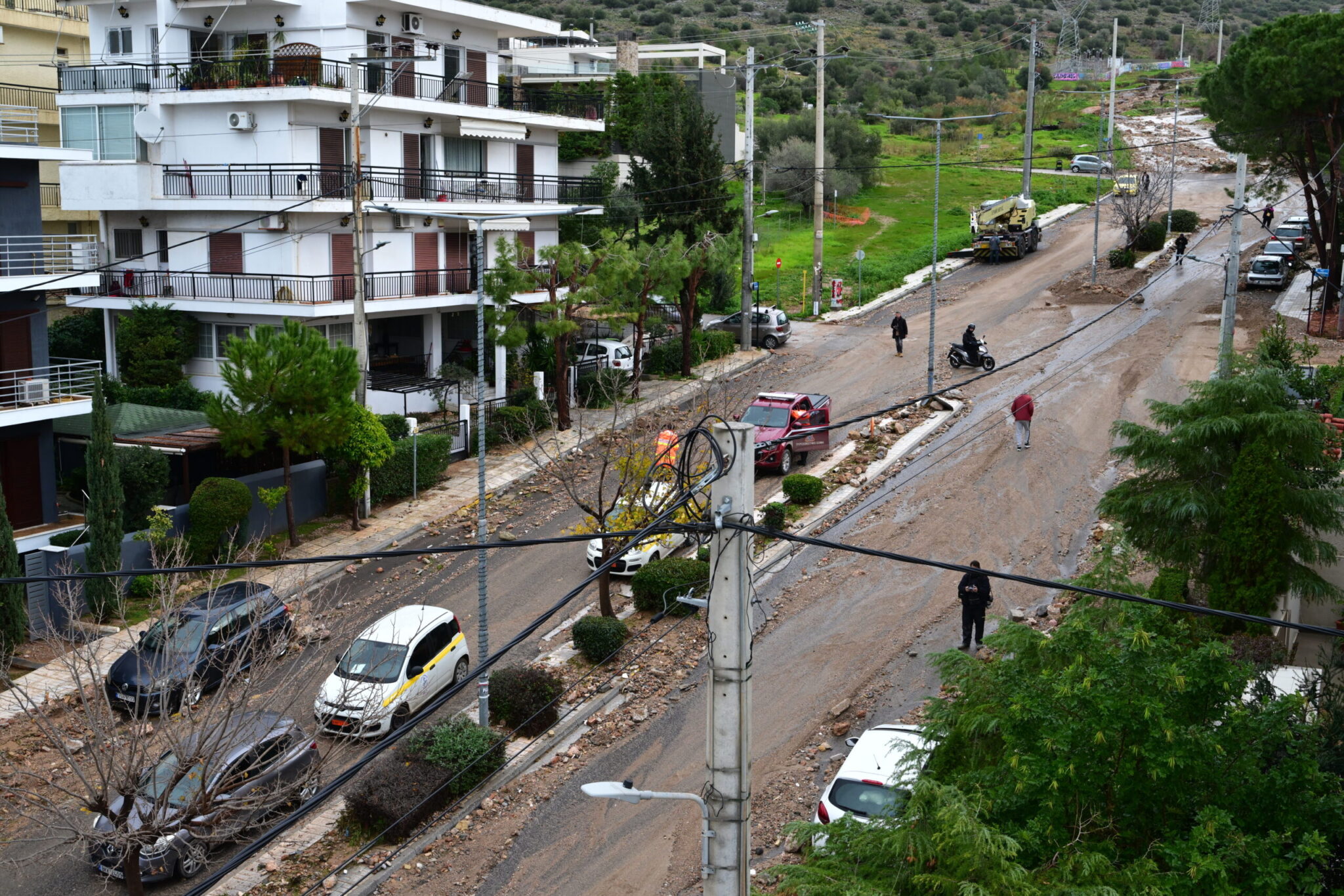 Πέτρες και άλλα φερτά υλικά είχαν «πλημμυρίσει» τους δρόμους, τα λασπόνερα ήταν παντού, οχήματα είχαν εγκλωβιστεί από το νερό της βροχής ακόμη και μέσα σε πυλωτές ενώ άλλα ήταν αδύνατον να μετακινηθούν καθώς ήταν παγιδευμένα από μικρά βουναλάκια που σχημάτισαν πέτρες και άλλα αντικείμενα.