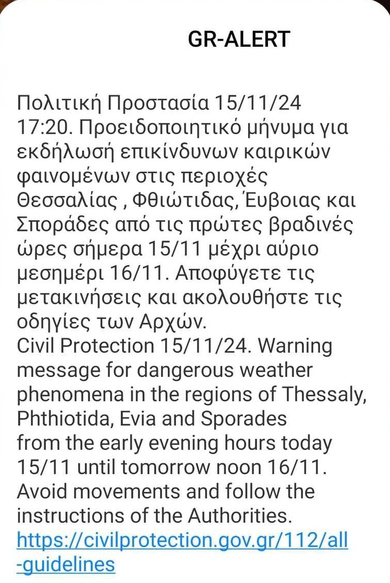 Νωρίτερα, μήνυμα έκτακτης ανάγκης από το 112 εστάλη το απόγευμα της Παρασκευής 15 Νοεμβρίου, προειδοποιώντας τους κατοίκους αρκετών περιοχών για την εκδήλωση επικίνδυνων καιρικών φαινομένων λόγω της κακοκαιρίας Aexandros. Το μήνυμα αφορά τη Θεσσαλία, τη Φθιώτιδα, την Εύβοια, τις Σποράδες και άλλες περιοχές, συμπεριλαμβανομένων των Γρεβενών, της Κοζάνης και της Καρδίτσας.