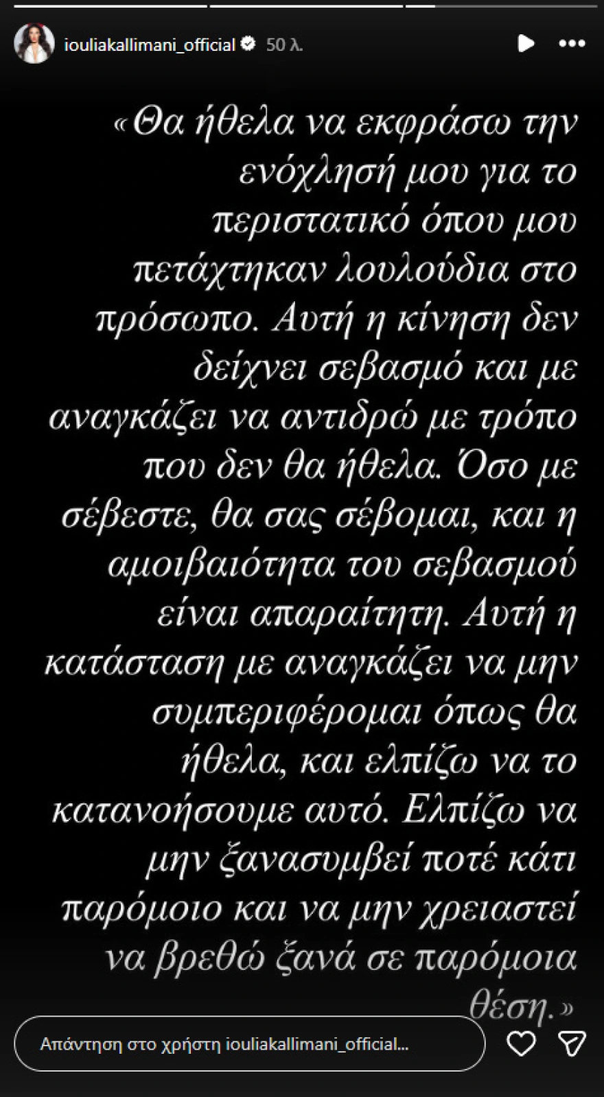 Η Ιουλία Καλλιμάνη προχώρησε σε ανάρτηση σχετικά με το περιστατικό που σημειώθηκε κατά τη διάρκεια εμφάνισής της στην Κρήτη, όταν εκνευρίστηκε και έβρισε πελάτη που της πέταξε λουλούδια και νερό στο πρόσωπο.