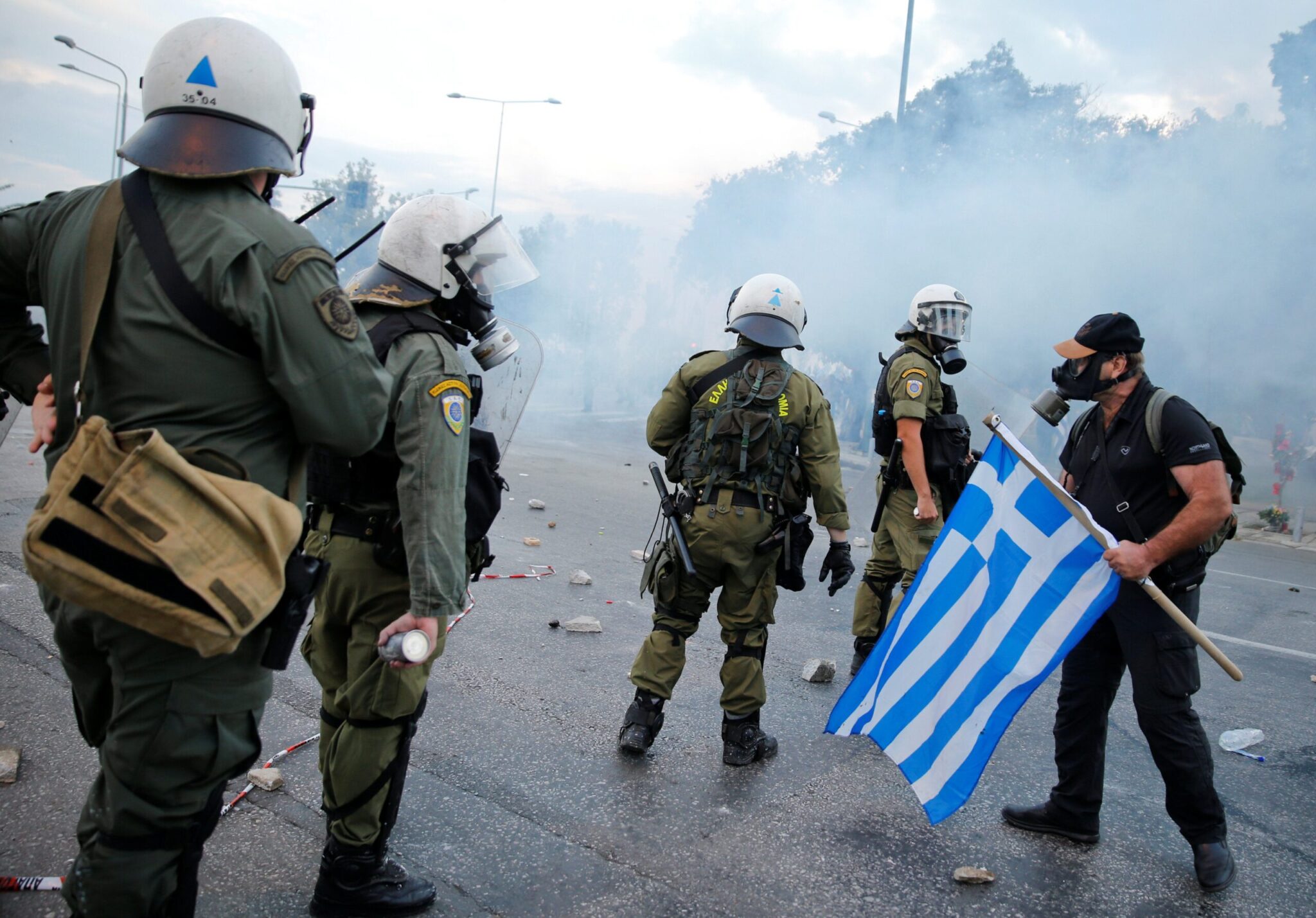 Όπως φαίνεται και στις φωτογραφίες οι τεράστιες σημαίες τυλίχτηκαν γύρω από χοντρά καδρόνια και μετατράπηκαν σε όπλα στις συγκρούσεις με τις δυνάμεις της αστυνομίας. Κάποιοι εξ αυτών που ενεπλάκησαν στα επεισόδια εμφανίζονται να φορούν κράνη και κουκούλες.