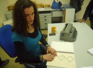 Άννα: «Η άλγευρα είναι εύκολη με το σύστημα μπράιγ. Τη γεωμετρία στο λύκειο, χωρίς τα μαθήματα εδώ, δεν θα μπορούσα να την παρακολουθήσω. Στο μάθημα βγαίνω έξω. Με τον Παναγιώτη μελετάμε βιβλία με ανάγλυφα σχήματα, έχουμε και ειδικά χαρτιά που μου σχεδιάζει τα σχήματα και τα ψηλαφώ με το χέρι. Εγώ προτιμώ να διαβάζω με μπράιγ, όταν ακούω τις ηχογραφήσεις και μου γίνεται το κεφάλι καζάνι και με παίρνει ο ύπνος».