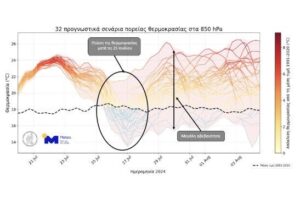 Σύμφωνα με γράφημα και πρόβλεψη του meteo.gr, παρουσιάζονται 32 προγνωστικά σενάρια από τις 20 Ιουλίου έως 4 Αυγούστου 2024 από το Εθνικό Κέντρο Περιβαλλοντικών Προγνώσεων των ΗΠΑ, για την πορεία της θερμοκρασίας σε ύψος περίπου 1.500 μ πάνω από τη μέση στάθμη της θάλασσας, ύψος στο οποίο μελετάται η πορεία των αερίων μαζών.
