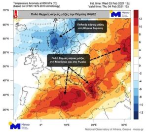 Τις πρώτες ημέρες του Φεβρουαρίου, ιδιαίτερα θερμές για την εποχή αέριες μάζες έχουν καλύψει τη Μεσόγειο, την Ανατολική Ευρώπη και τη Ρωσία. Σύμφωνα με τα προγνωστικά στοιχεία, τις επόμενες ημέρες η μεταφορά θερμών αερίων μαζών προς τη Μεσόγειο αναμένεται να ενταθεί, με κορύφωση την Κυριακή 07/02.