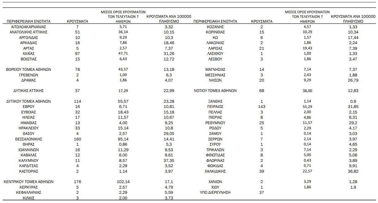 Από τα νέα κρούσματα, 687 εντοπίζονται στην Αττική (51 κρούσματα στην Π.Ε. Ανατολικής Αττικής, 78 κρούσματα στην Π.Ε. Βόρειου Τομέα Αθηνών, 114 κρούσματα στην Π.Ε. Δυτικού Τομέα Αθηνών, 37 κρούσματα στην Π.Ε. Δυτικής Αττικής, 176 κρούσματα στην Π.Ε. Κεντρικού Τομέα Αθηνών, 68 κρούσματα στην Π.Ε. Νοτίου Τομέα Αθηνών, 143 κρούσματα στην Π.Ε Πειραιώς, 20 κρούσματα στην Π.Ε Νήσων)και 160 στη Θεσσαλονίκη.
