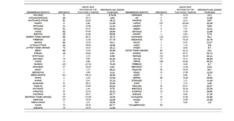 Ο συνολικός αριθμός των κρουσμάτων ανέρχεται σε 714.283 (ημερήσια μεταβολή +0.4%), εκ των οποίων 50.8% άνδρες. Με βάση τα επιβεβαιωμένα κρούσματα των τελευταίων 7 ημερών, 149 θεωρούνται σχετιζόμενα με ταξίδι από το εξωτερικό και 3.248 είναι σχετιζόμενα με ήδη γνωστό κρούσμα.