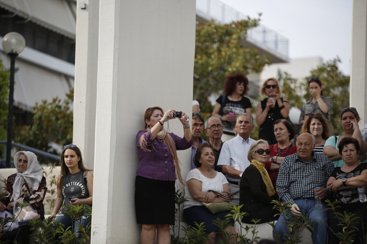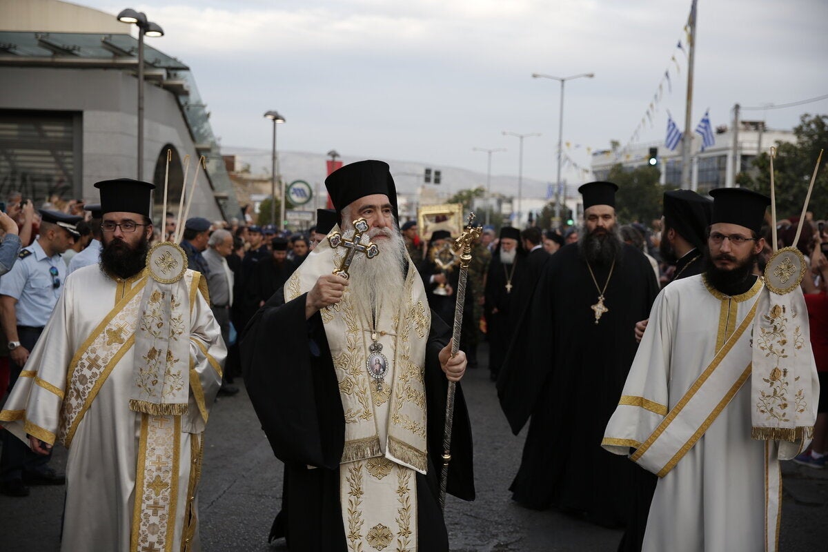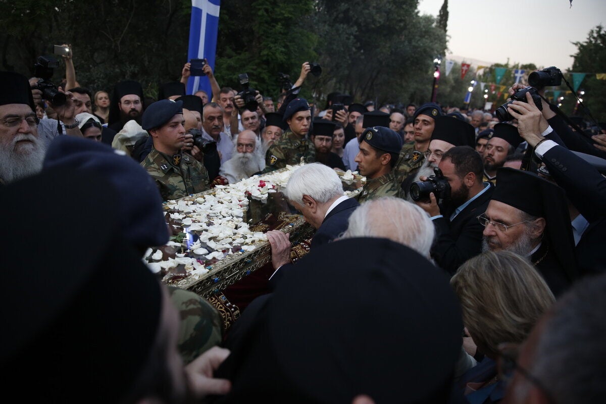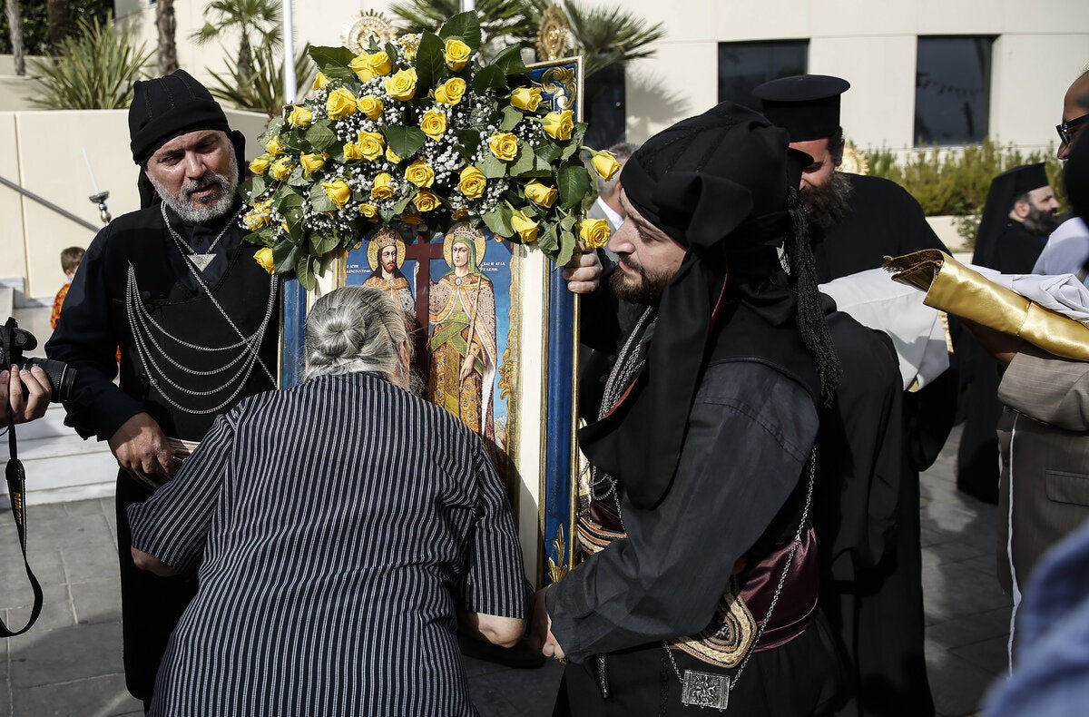 Νωρίτερα, ο μητροπολίτης Νικαίας υποδέχθηκε το ιερό λείψανο στο Δημαρχείο Αιγάλεω και εν συνεχεία η λιτανευτική πομπή με το ιερό λείψανο της Αγίας Ελένης και το Τίμιο Ξύλο μεταφέρθηκε στο ιερό προσκύνημα της Αγίας Βαρβάρας, όπου έγινε προσφώνηση από τον Επίσκοπο Φαναρίου, διευθυντή της Αποστολικής Διακονίας Αγαθάγγελο, ακολούθησε ο λόγος του Αρχιεπισκόπου Αθηνών και πάσης Ελλάδος Ιερωνύμου, ενώ στη συνέχεια απηύθυνε χαιρετισμό ο Πρόεδρος της Δημοκρατίας Προκόπης Παυλόπουλος με έμφαση στην ανάδειξη της πνευματικής ταυτότητας της Ευρώπης.