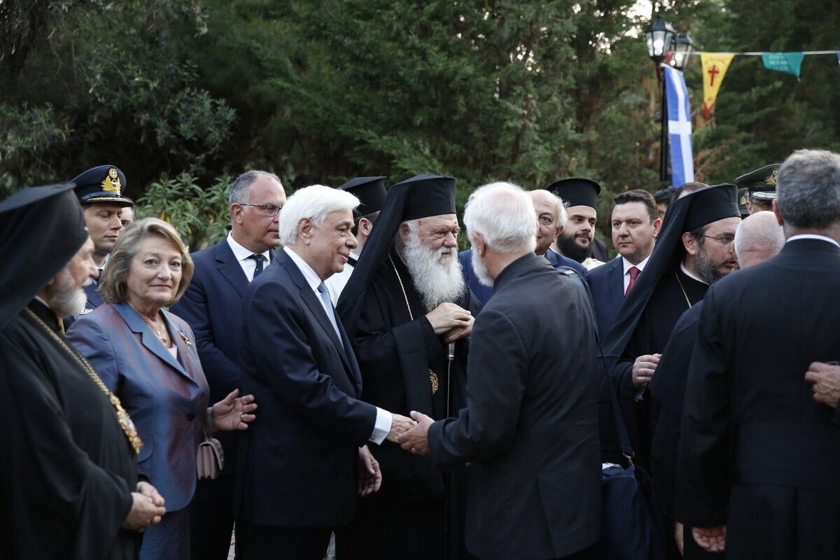Ακολούθως, ο Προκαθήμενος της Ελλαδικής Εκκλησίας κατά την ομιλία του δήλωσε, μεταξύ άλλων, εμφατικά: «Σας καλώ και σας παρακαλώ να αδράξουμε τον κόσμο σε μια μεγάλη αναστάσιμη κίνηση. Σας καλώ να κάνουμε ο ένας τον άλλον μια σταυρική αγκαλιά και να παραμείνουμε στον Σταυρό του Χριστού με μια ταπεινή συγκατάθεση λέγοντες ‘’Κύριε, μνήσθητι ημών εν τη βασιλεία σου”. Μόνον έτσι μπορούμε να αντέξουμε, να υπομένουμε, να αγαπάμε, να ελπίζουμε». Στη συνέχεια, ευχαρίστησε τον Πρόεδρο της Δημοκρατίας για την παρουσία του «κατ’ αυτή την ευλογημένη στιγμή» και ως ανάμνηση της παρουσίας του «σε αυτό το ιστορικό προσκύνημα» του απένειμε το μετάλλιο του Σταυρού των Αγίων Κωνσταντίνου και Ελένης ως τιμητική διαμνημόνευση «και ως ευλογία ό,τι πολυτιμότερο φυλάσσεται εδώ, το αντίγραφο της ιεράς εικόνος της Αγίας Βαρβάρας», η οποία φυλάσσεται στο ναό.