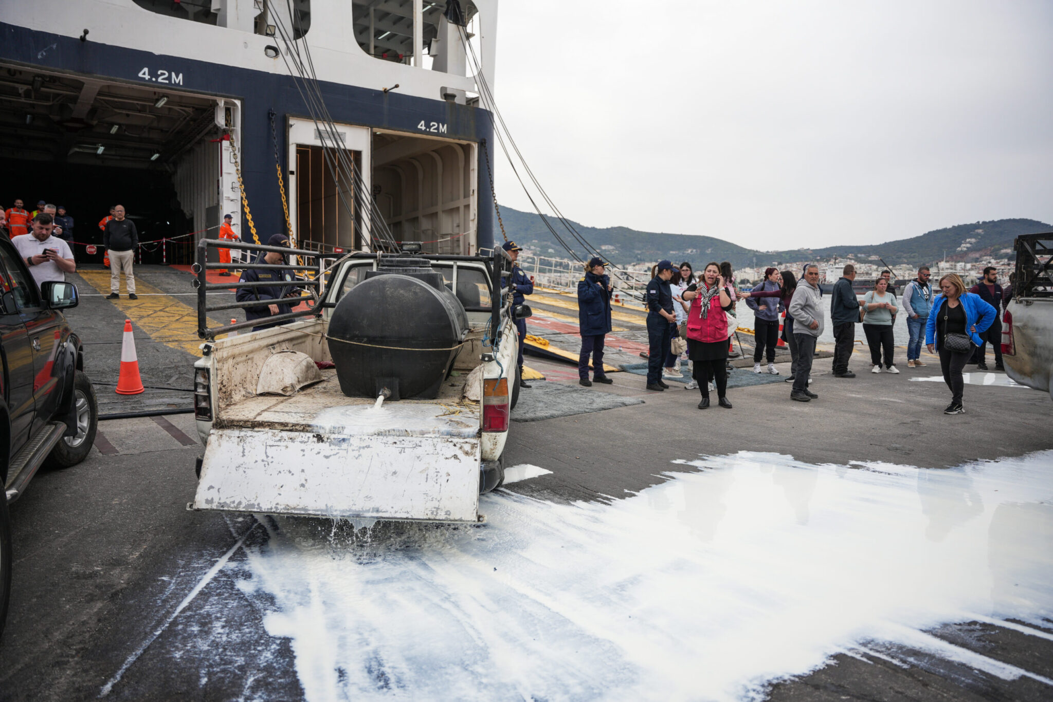Η ένταση κορυφώθηκε το μεσημέρι της Τετάρτης του Πάσχα, όταν κατά την άφιξη του πλοίου Blue Star Patmos οι συγκεντρωμένοι δεν επέτρεψαν την αποβίβαση φορτηγών με εμπορεύματα, ανάμεσά τους και ευπαθή προϊόντα. Επιτράπηκε μόνο η αποβίβαση επιβατών, ΙΧ, καθώς και οχημάτων με στρατιωτικό υλικό και φαρμακευτικά προϊόντα. Σύμφωνα με τις διαθέσιμες πληροφορίες, μέσα στο πλοίο παρέμειναν εγκλωβισμένα 42 φορτηγά και ένα λεωφορείο, ενώ αβέβαιη εμφανιζόταν και η εκτέλεση του απογευματινού δρομολογίου.