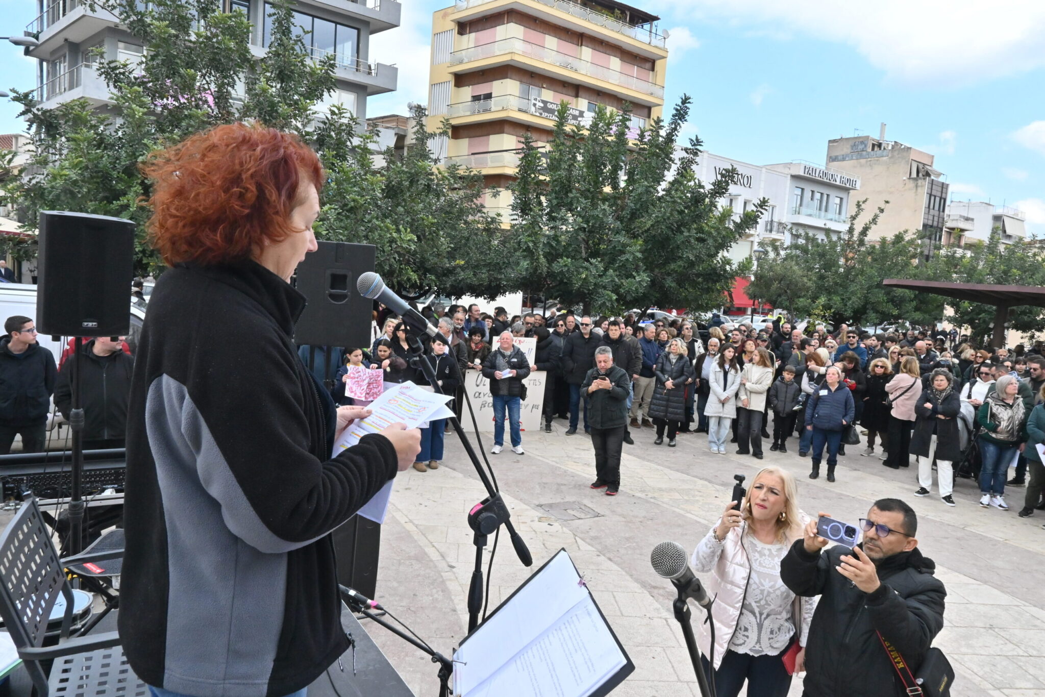 Αρκετός κόσμος συγκεντρώθηκε στη Λάρισα, στην Κεντρική Πλατεία για τα τρία χρόνια μετά τη σιδηροδρομική τραγωδία των Τεμπών, όπου 57 άνθρωποι έχασαν τη ζωή τους.