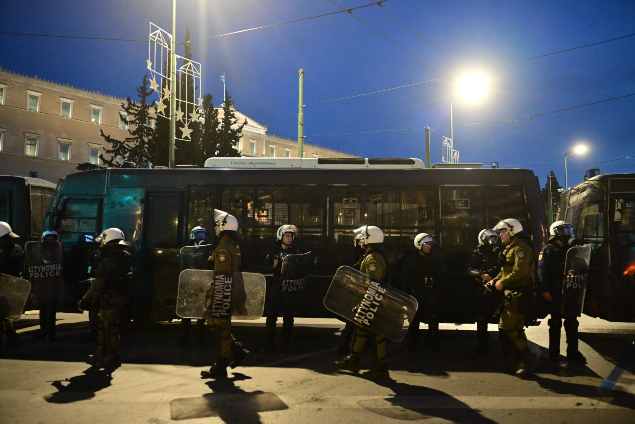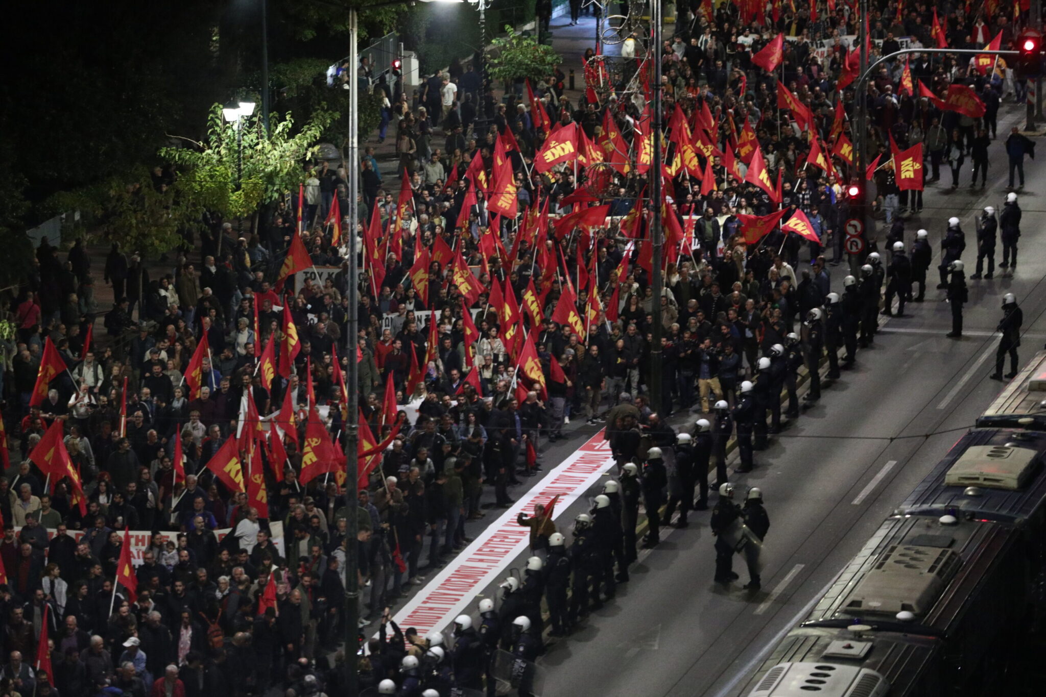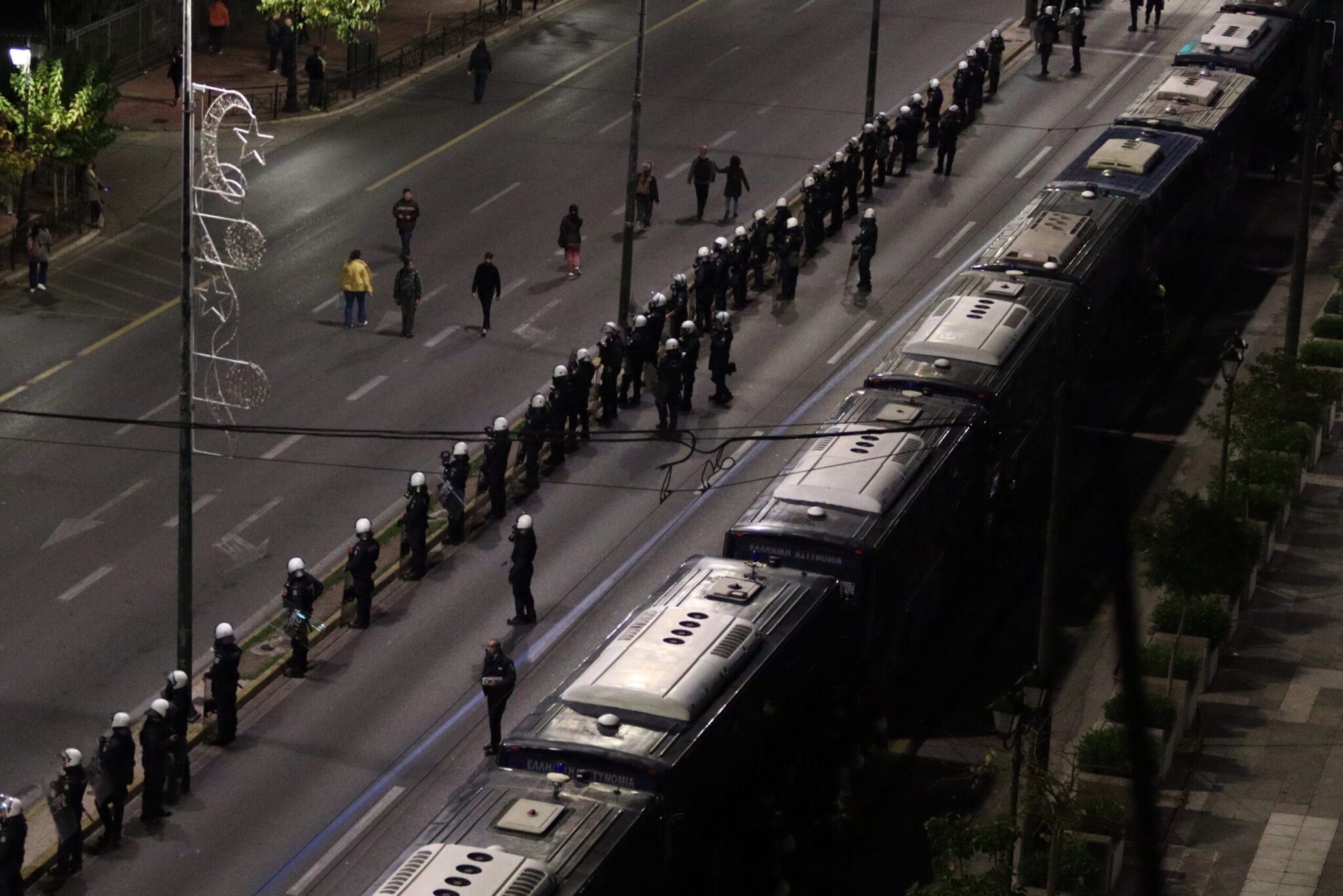 Αστυνομικές δυνάμεις είναι ακροβολισμένες στις παρόδους και διασταυρώσεις των οδών κατά μήκος της διαδρομής, καιροφυλακτώντας για να αποτρέψουν τυχόν έκτροπα. Drones της Αστυνομίας ίπτανται διαρκώς, κατοπτεύοντας την ομαλή διεξαγωγή της πορείας. Πάνω από 5.000 αστυνομικοί έχουν κινητοποιηθεί για να εξασφαλίσουν την τάξη στο κέντρο της Αθήνας.