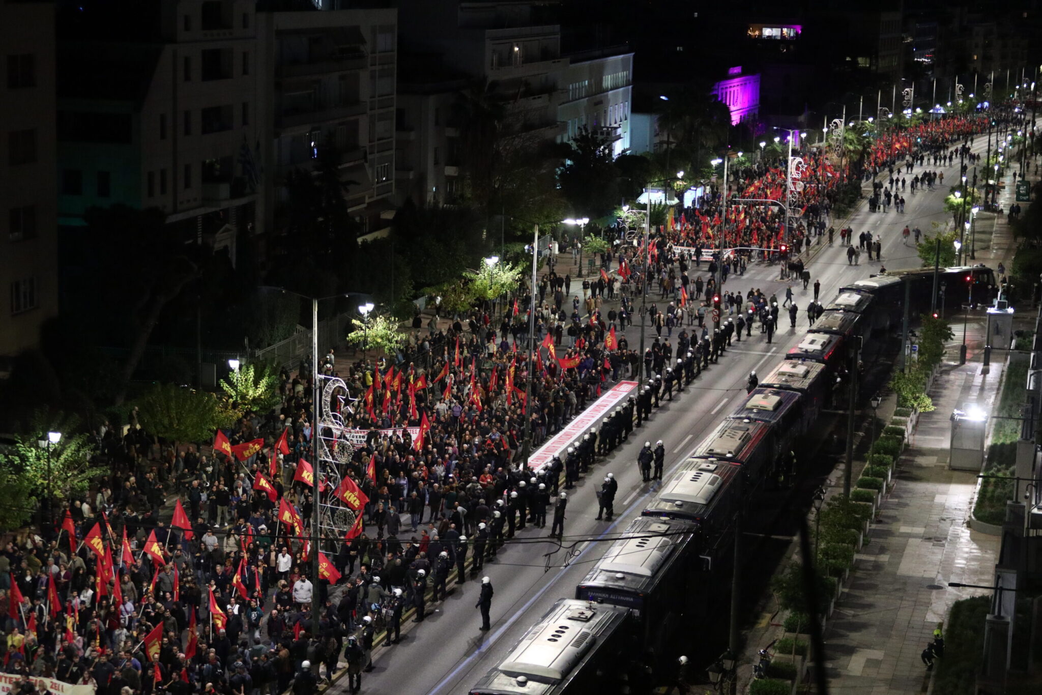 Χιλιάδες άνθρωποι – σύμφωνα με εκτιμήσεις πάνω από 15.000 – συμμετέχουν στη μεγάλη πορεία του Πολυτεχνείου. Τα μπλοκ των διαδηλωτών έχουν περάσει όλα από το Σύνταγμα, όπου είχε στηθεί τείχος από κλούβες των ΜΑΤ ώστε να μην προσεγγίσει κανείς το μνημείο του Άγνωστου Στρατιώτη. Η κεφαλή της πορείας βρίσκεται πλέον στο Χίλτον.