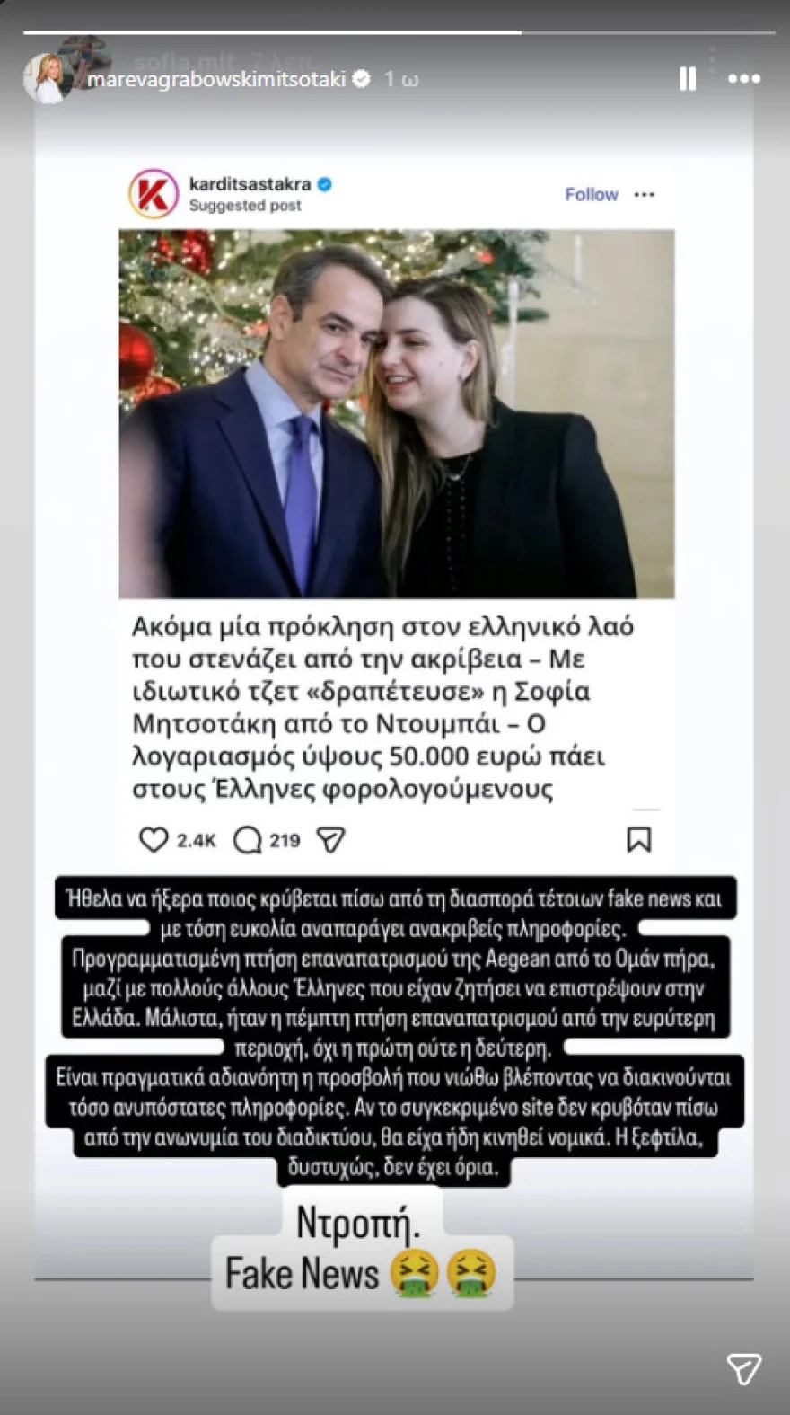 Το δικό της σχόλιο στο δημοσίευμα που ηθελε την κόρη της Σοφία Μητσοτάκη να επιστρέφει από το Ντουμπάι με ιδιωτική πτήση αξίας 50.00 ευρώ τα οποία χρεώθηκαν οι έλληνες φορολογούμενοι έδωσε η Μαρέβα Μητσοτάκη.