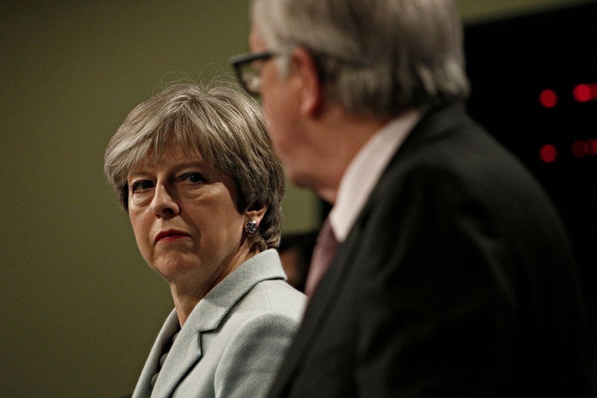 Prime Minister of the United Kingdom Theresa May and European Commission President Jean-Claude Juncker hold a press conference after their meeting at the EU Commission headquarters in Brussels, Belgium on Dec. 8, 2017.