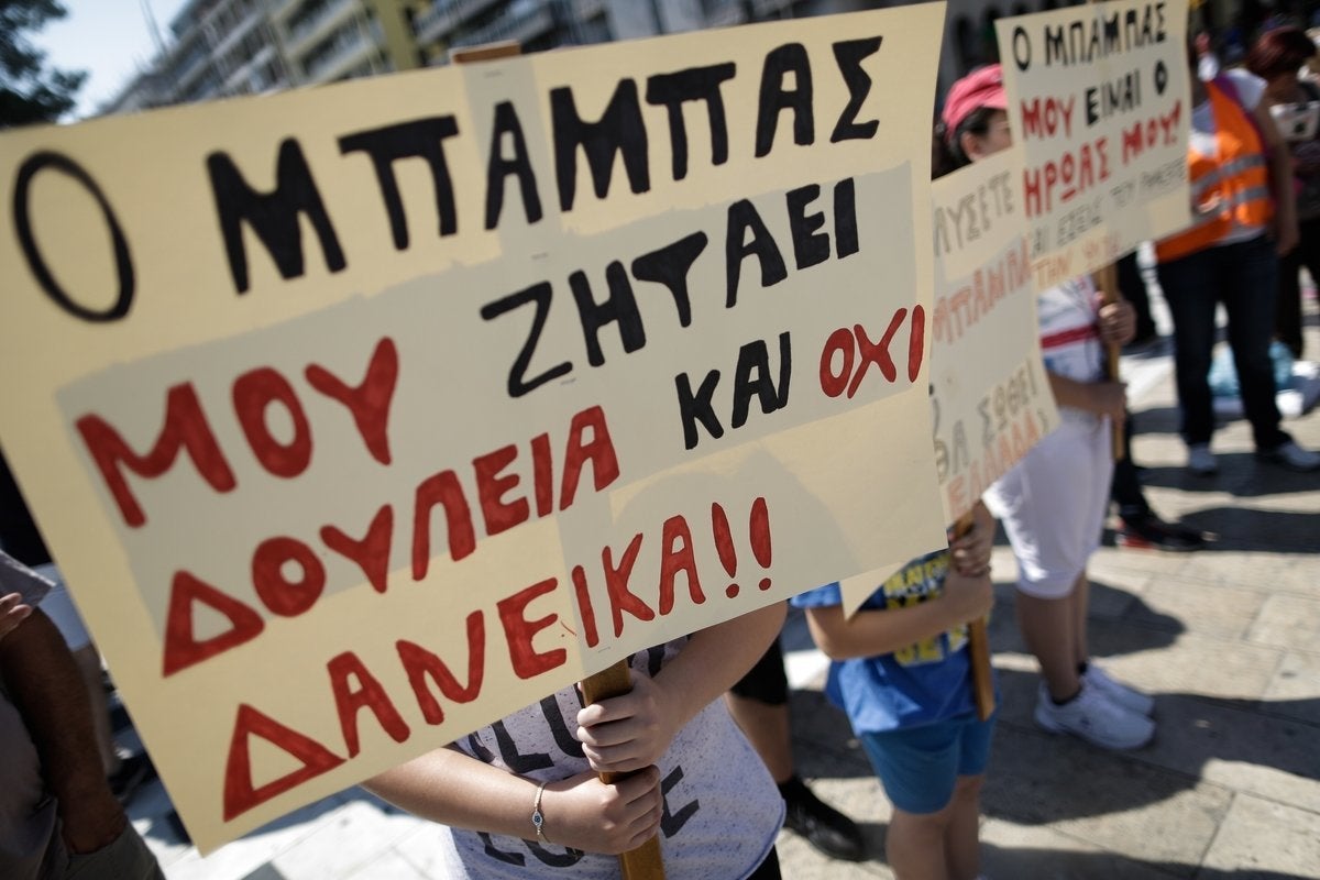 Protest march by members of the Panhellenic Federation of Workers of Local Government Organizations (POE-OTA) claiming the appointment of the contract workers employed in Local Government during their 24 hours strike, in Thessaloniki, Greece, June 22, 2017.u0026nbsp;