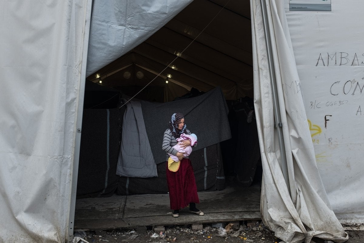 A woman holding a baby stands at the entrance of a tent, inside the Moria camp on the island of Lesbos, Greece, on November 28, 2017u0026nbsp;