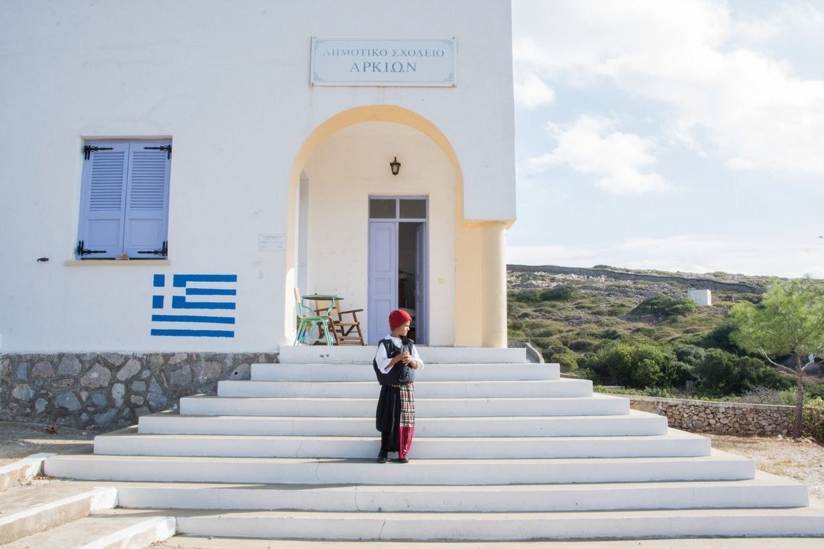Students parade commemorating Greece’s entry in World War II in 1940, in Arkioi Island, on October 28, 2017. Arkioi Island is inhabited by 44 residents, with only on student and a teacher