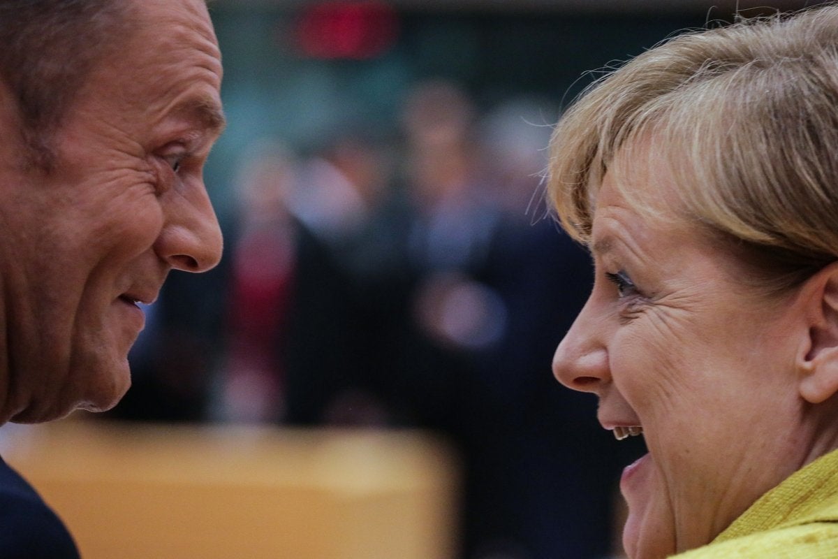 President of the European Council, Donald Tusk, and German Chancellor, Angela Merkel, talk at the European Union leaders summit at the European Council in Brussels, Belgium on Dec. 14, 2017u0026nbsp;