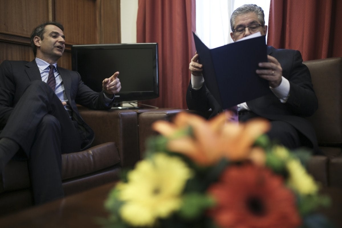 Meeting between the president of New Democracy party, Kyriakos Mitsotakis and the General Secretary of Communist Party of Greece Dimitris Koutsoumpas, in Athens, on April 6, 2017