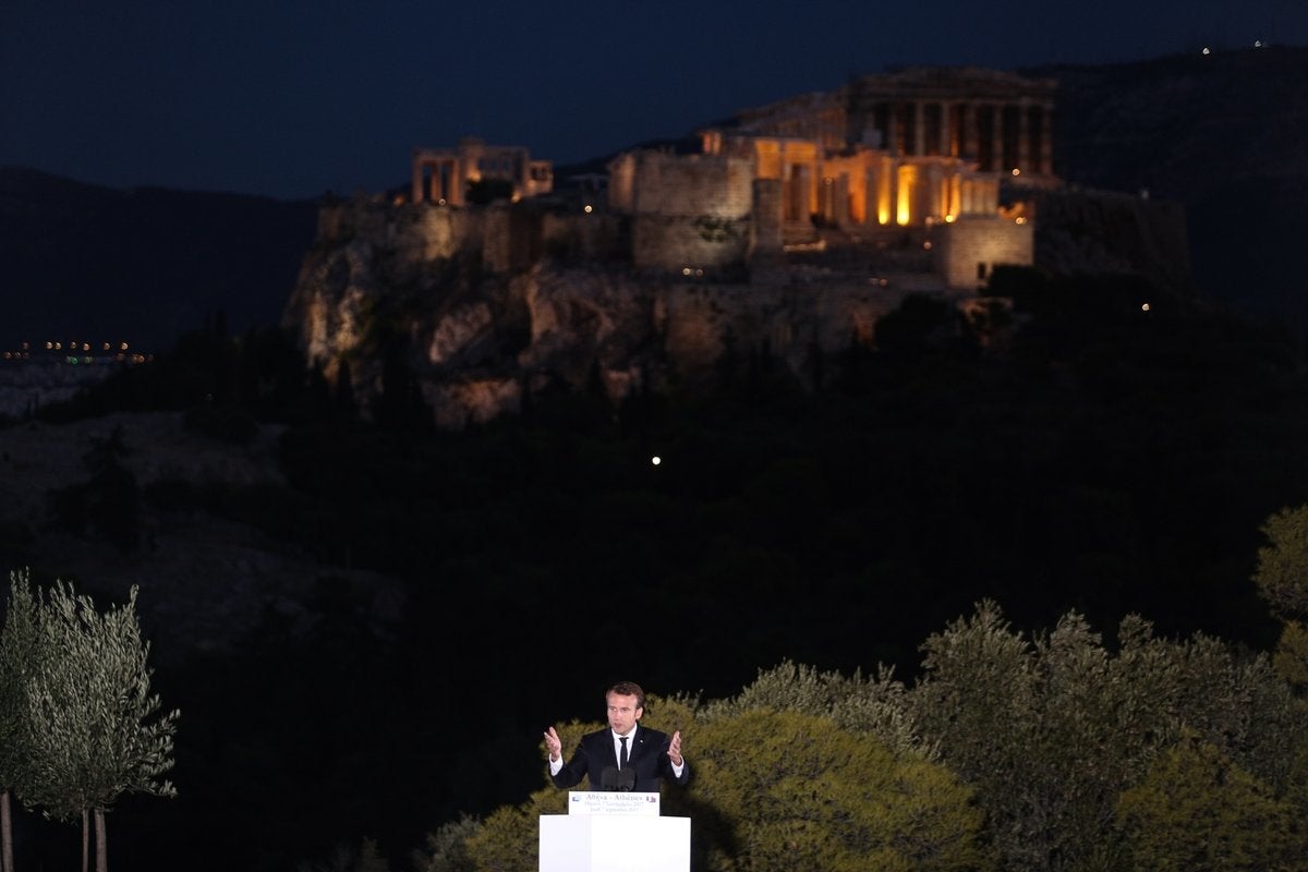 The President of France Emmanuel Macron, delivers his speech at the Pnyka Hill, in Athens, Greece, on September 7, 2017u0026nbsp;