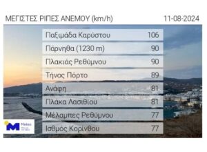 Σύμφωνα με το δίκτυο αυτόματων μετεωρολογικών σταθμών του Εθνικού Αστεροσκοπείου Αθηνών / meteo.gr η υψηλότερη μέγιστη ριπή ανέμου την Κυριακή σημειώθηκε στην Παξιμάδα Καρύστου με 106 km/h, ενώ οι οκτώ περιοχές με τις υψηλότερες μέγιστες ριπές παρουσιάζονται στον παρακάτω πίνακα.