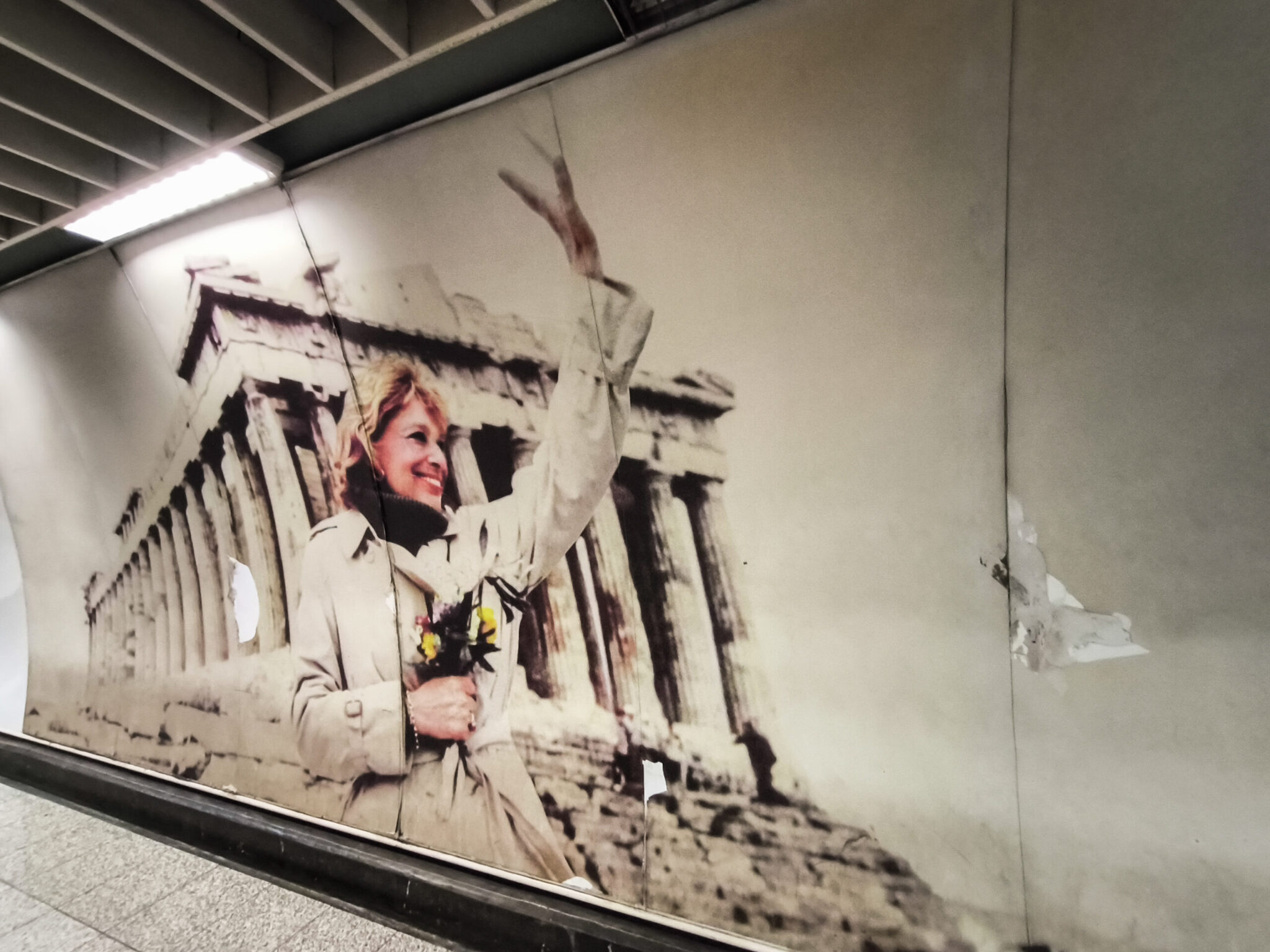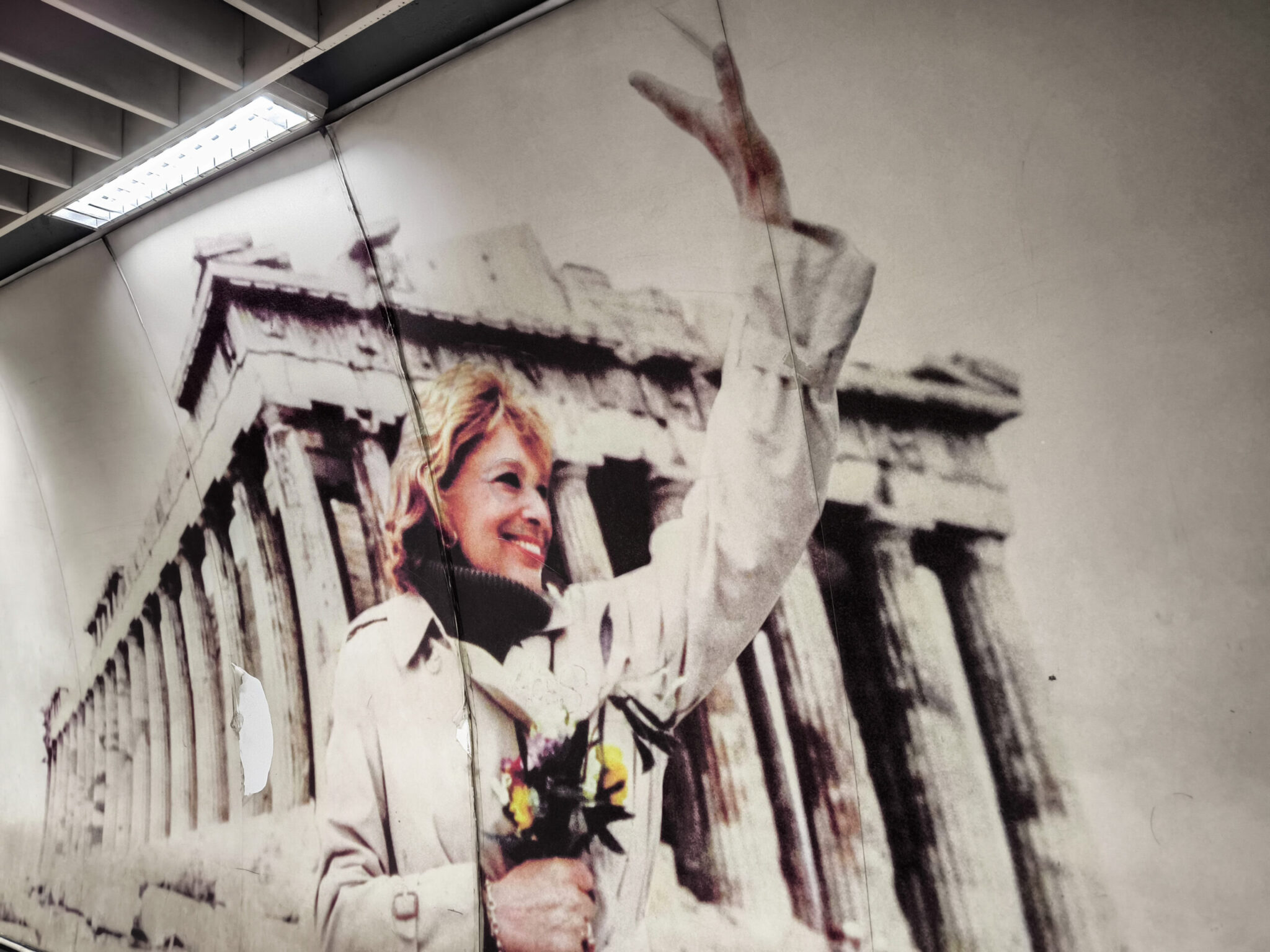 Πρόκειται για την περίφημη φωτογραφία που απεικονίζει την τότε υπουργό Πολιτισμού να χαιρετά χαμογελαστή πάνω στον Ιερό Βράχο της Ακρόπολης, κρατώντας ένα μπουκέτο λουλούδια. Βρίσκεται στο σταθμό του μετρό «Ακρόπολη» από την αρχή της δημιουργίας του και κάποιοι την βανδάλισαν.
