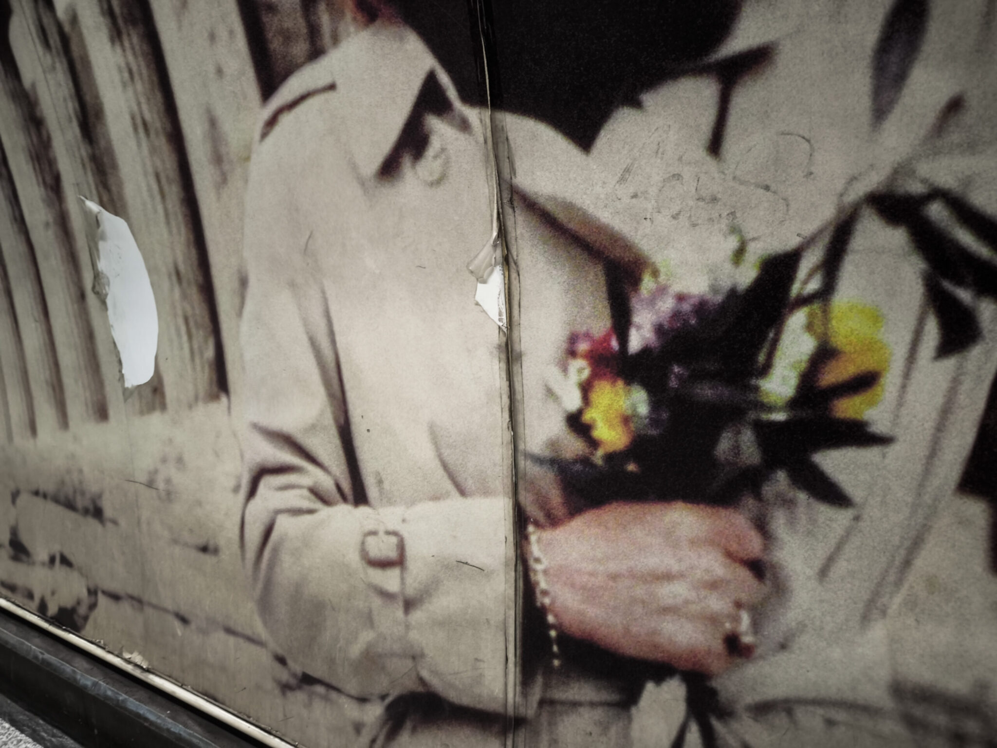Πρόκειται για την περίφημη φωτογραφία που απεικονίζει την τότε υπουργό Πολιτισμού να χαιρετά χαμογελαστή πάνω στον Ιερό Βράχο της Ακρόπολης, κρατώντας ένα μπουκέτο λουλούδια. Βρίσκεται στο σταθμό του μετρό «Ακρόπολη» από την αρχή της δημιουργίας του και κάποιοι την βανδάλισαν.