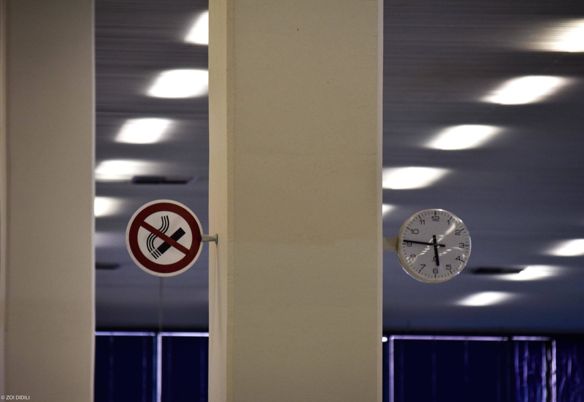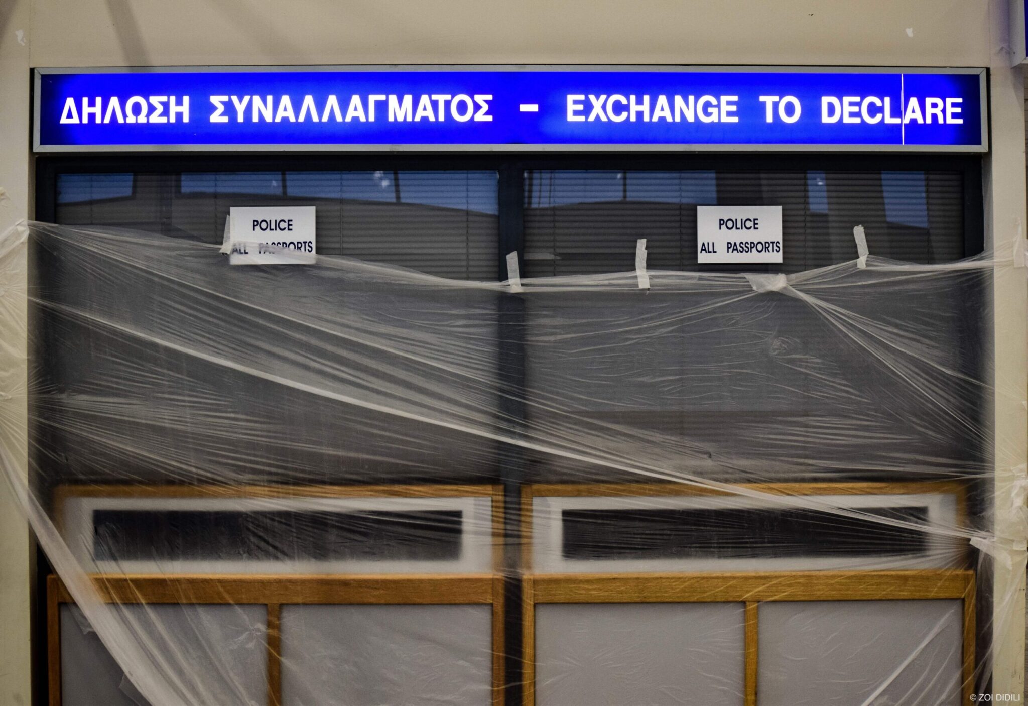 Ανήσυχα βλέμματα επιβατών αναζητούν την έξοδο, αφού αυτή κρύβεται πίσω από παρατημένο νάυλον, ενώ απουσιάζουν και οι οποιεσδήποτε ενδείξεις. Αντί για ενδείξεις, τους ώχρινους τοίχους κοσμούν γκραβούρες, χάρτες και πίνακες που απεικονίζουν την ελληνικότητα της Μακεδονίας, καθώς και τυπώσεις Α4 που εφιστούν την προσοχή για τα έργα. Βγαίνοντας, βλέπει κανείς το ολοκαίνουριο γραφείο δήλωσης συναλλάγματος, που μοιάζει να έχει ήδη κουραστεί, προτού ακόμα να τεθεί σε λειτουργία.