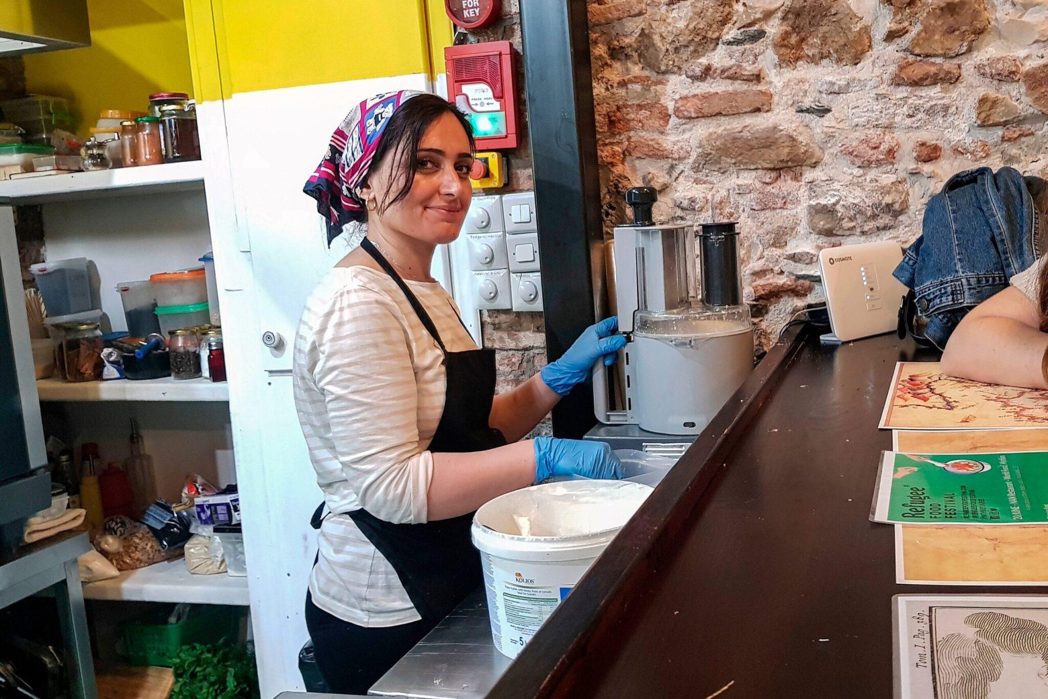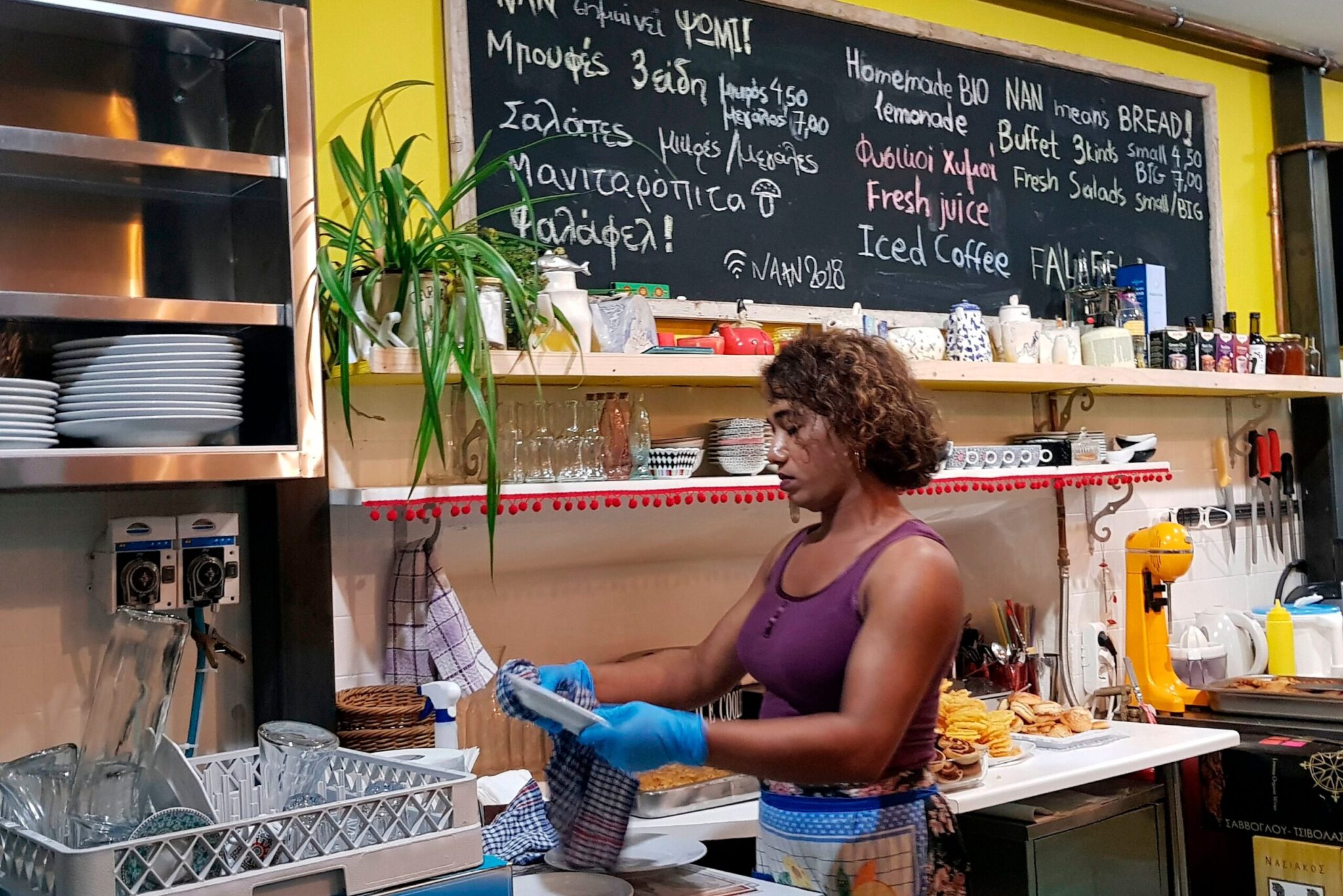 Μαγειρεύοντας πίσω από τον πάγκο που την χωρίζει από την αίθουσα, η Χοουέντα Εμπραχέμ, μία 30χρονη από την Συρία, ζει εδώ και ενάμιση χρόνο στην Λέσβο με τον σύζυγό της, που εργάζεται για μία μη κυβερνητική οργάνωση, και τις κόρες τους 11, 9 και 4 ετών που πηγαίνουν σε ελληνικό σχολείο.