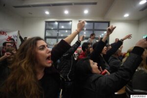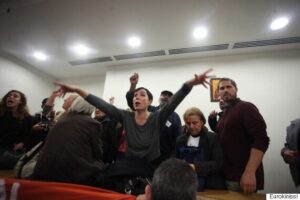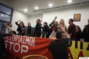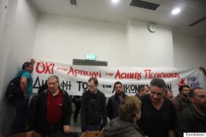 Για μία ακόμη φορά διαμαρτυρόμενοι πολίτες μπλόκαραν τους πλειστηριασμούς. Αυτή τη φορά οι διαδηλωτές εισέβαλαν στο Ειρηνοδικείο Αθηνών όπου ύψωσαν πανό και φώναζαν συνθήματα, με συνέπεια η Ειρηνοδίκης να διακόψει τη διαδικασία και να φύγει από την αίθουσα.
