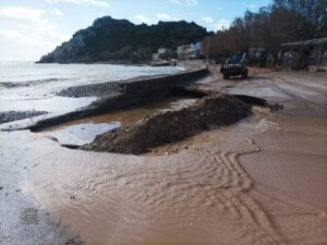 Τα πιο σημαντικά προβλήματα από την πρώτη ημέρα της κακοκαιρίας Erminio, εντοπίζονται στον παραλιακό δρόμο, στο λιμανάκι του Εμπορειού που οδηγεί και προς τη διάσημη παραλία Μαύρα Βόλια.