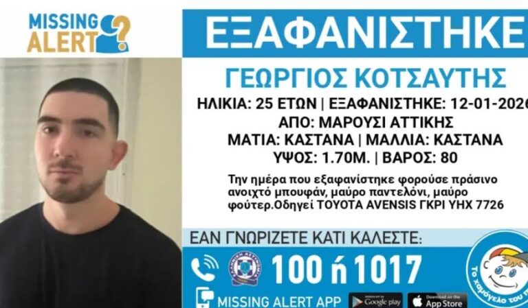 Νεκρός εντοπίστηκε ο 25χρονος Γιώργος Κοτσαύτης τα ίχνη του οποίου είχαν χαθεί από το Μαρούσι στις 12 Ιανουαρίου 2026.