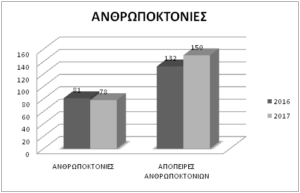Το 2017 καταγράφηκαν σε όλη την επικράτεια (78) υποθέσεις ανθρωποκτονιών, από τις οποίες οι (21) έγιναν με κίνητρο τις προσωπικές διαφορές, ενώ το 2016 είχαν καταγραφεί (81) από τις οποίες οι (30) είχαν κίνητρο προσωπικές διαφορές. Επίσης διαπράχθηκαν (150) απόπειρες ανθρωποκτονίας, έναντι (132) που είχαν καταγραφεί το 2016.