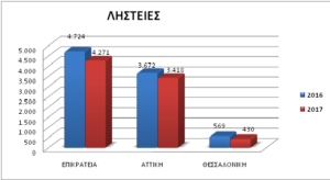 Το έτος 2017, σε σύγκριση με το 2016, μειώθηκαν οι ανθρωποκτονίες σε ποσοστό 3,7%, οι ληστείες σε ποσοστό 9,6%, ενώ ανεπαίσθητη αύξηση της τάξης του 0,8 %, καταγράφεται στις κλοπές-διαρρήξεις.