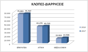 Συγκεκριμένα, σε επίπεδο επικράτειας, καθώς και στις πόλεις της Αθήνας και Θεσσαλονίκης όπου καταγράφεται ο κύριος όγκος των κλοπών και των διαρρήξεων, στη σύγκριση του έτους 2017 σε σχέση με το έτος 2016, καταγράφονται τα εξής :