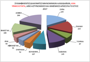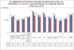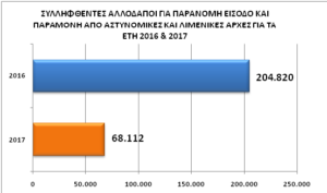 Το 2017 καταγράφηκε σημαντικά μικρότερος αριθμός μεταναστευτικών-προσφυγικών ροών με αποτέλεσμα να συλληφθούν συνολικά (68.112) αλλοδαποί για παράνομη είσοδο και παραμονή στη χώρα, από Αστυνομικές και Λιμενικές Αρχές. Σημειώνεται ότι το έτος το 2016 είχαν συλληφθεί (204.820) αλλοδαποί, με αποτέλεσμα να καταγράφεται ποσοστό μείωσης πάνω από 66,7%.