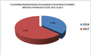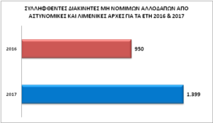 Επιπλέον, το 2017 συνελήφθησαν (1.399) διακινητές παράτυπων μεταναστών, ενώ το 2016 είχαν συλληφθεί (950), ποσοστό αύξησης της τάξεως περίπου 47,3 %.