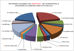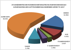 Επίσης το 2017, η χώρα μας διαχειρίστηκε σημαντικά μικρότερο αριθμό μεταναστευτικών και προσφυγικών ροών, κυρίως μέσω των θαλάσσιων συνόρων με την Τουρκία, με αποτέλεσμα να συλληφθούν από τις Αστυνομικές και τις Λιμενικές Αρχές, συνολικά (68.112) παράτυποι μετανάστες, έναντι (204.820) το 2016. Επιπρόσθετα συνελήφθησαν (1.399) διακινητές παράτυπων μεταναστών, ενώ το 2016 είχαν συλληφθεί (950).