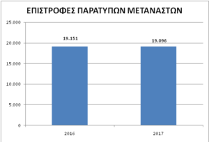 Τo 2017 πραγματοποιήθηκαν συνολικά (19.096) επιστροφές παράτυπων μεταναστών, έναντι (19.151) το 2016. Από αυτές, οι (13.439) περιπτώσεις πραγματοποιήθηκαν μέσω των προγραμμάτων αναγκαστικής επιστροφής και οι (5.657) μέσω των εθελούσιων διαδικασιών επιστροφής.
