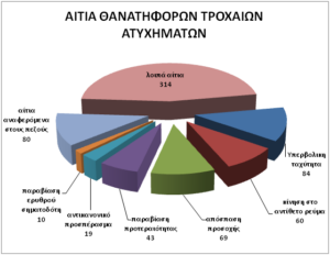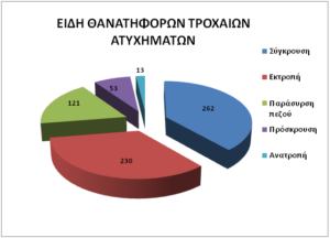 Επίσης, από την ανάλυση των θανατηφόρων τροχαίων ατυχημάτων, προκύπτει ότι οφείλονται (κατά είδος) :