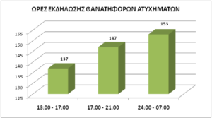 Τα περισσότερα θανατηφόρα ατυχήματα συνέβησαν κατά τις ώρες 24.00΄ έως 07.00΄ (153 ατυχήματα) και ακολούθως κατά τις ώρες 17 .00΄ έως 21.00΄ (147 ατυχήματα) και 13.00΄ έως 17.00΄ (137 ατυχήματα).