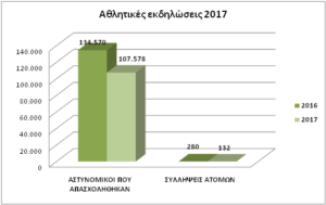 Παράλληλα, το 2017, ένας μεγάλος αριθμός και συγκεκριμένα (101.071) αστυνομικοί διατέθηκαν για την ομαλή διεξαγωγή και τη διατήρηση της δημόσιας τάξης στις (3.881) κινητοποιήσεις, συγκεντρώσεις, συναθροίσεις και πορείες, που πραγματοποιήθηκαν σε ολόκληρη την Επικράτεια.