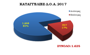Επισημαίνεται ότι, κατά τη διάρκεια του έτους 2017, η Διεύθυνση Οικονομικής Αστυνομίας, δέχθηκε συνολικά (1.625) καταγγελίες, μέσω του τηλεφωνικού κέντρου 11012 καθώς και από την αλληλογραφία της Υπηρεσίας. Από το σύνολο των καταγγελιών, οι (357) έγιναν επώνυμα, ενώ οι (1.268) ανώνυμα.