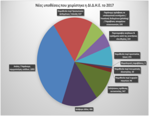 Ο συνολικός αριθμός νέων υποθέσεων που χειρίστηκε η Διεύθυνση Δίωξης Ηλεκτρονικού Εγκλήματος το έτος 2017 ανήλθε σε (3.120). Ο αριθμός αυτός αναφέρεται σε σχετικές εισαγγελικές παραγγελίες, ξεχωριστό προανακριτικό υλικό, εγκλήσεις πολιτών κ.λπ.