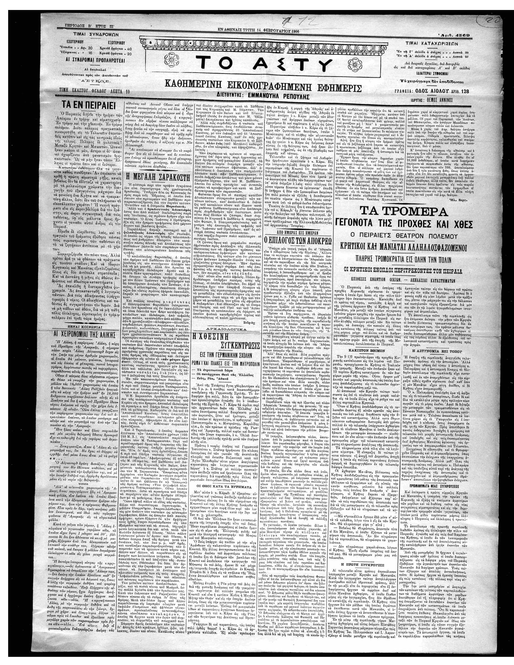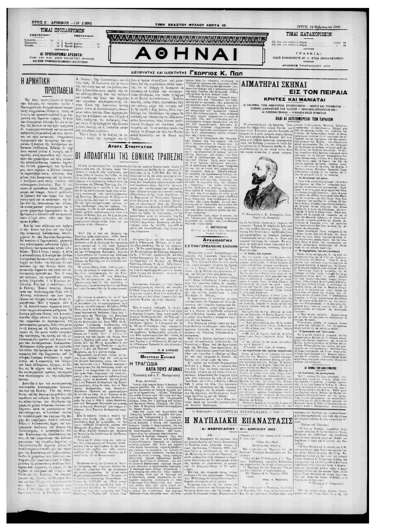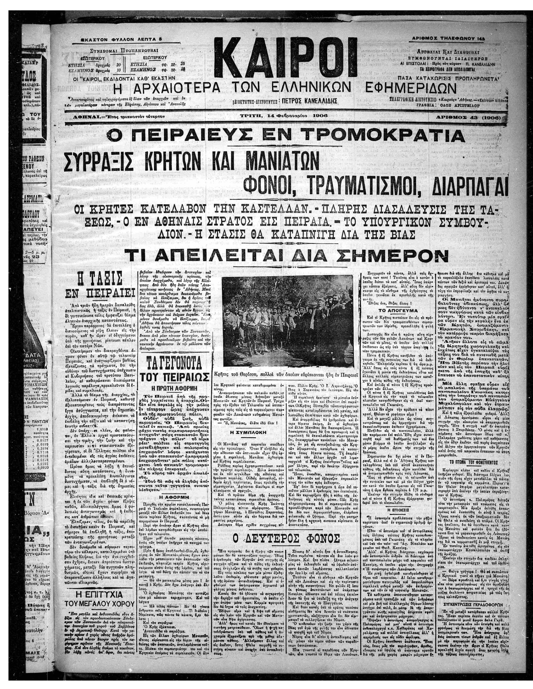 «Ο Πειραιεύς διήλθε την ημέρα των Απόκρεω εν τρόμω και αιματοχυσία. Εν τρόμω και την χθεσινήν. Εν τρόμω πολέμου. Διότι πόλεμος πραγματικός συνεκροτήθη εις το Τελωνείον, επεκταθείς κατόπιν εις τα κεντρικάς οδούς της πόλεως. Πόλεμος δε φυλετικός! Μεταξύ Κρητών και Μανιατών. Ωσανεί ήσαν μαύροι οι μεν, άσπροι οι δε. Ωσανεί εχωρίζοντο από φανατισμόν θρησκευτικόν. Ως να μην ήσαν τόσον Έλληνες οι πρώτοι όσον και οι δεύτεροι.