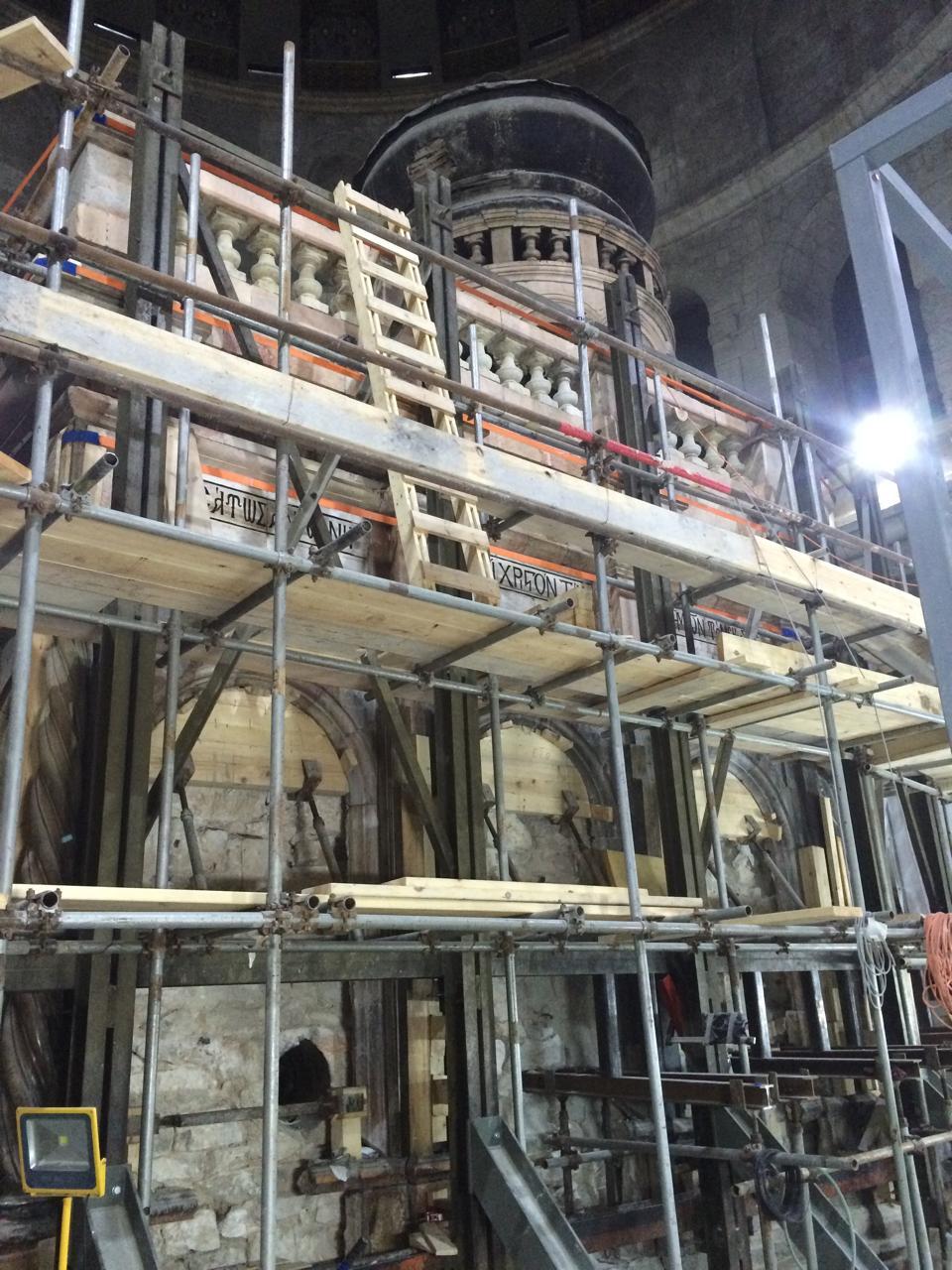 Για δεκαετίες το Ιερό Κουβούκλιο έστεκε τραυματισμένο. Είχε υποστεί σοβαρές φθορές ήδη από τον σεισμό του 1927, ενώ από το 1947 οι βρετανικές αρχές το είχαν «δέσει» με αντιαισθητικά σιδερένια υποστυλώματα για να μην καταρρεύσει. Το πρόβλημα, όμως, δεν ήταν μόνο ορατό. Κάτω από το μνημείο, οι έρευνες αποκάλυψαν σαθρά κονιάματα, μπάζα παλαιότερων φάσεων, κενά, σήραγγες και μια γενικευμένη αστάθεια που έκανε τους επιστήμονες να μιλούν ακόμη και για κίνδυνο «καταστροφικής» αστοχίας, αν δεν προχωρούσε άμεσα η επέμβαση.