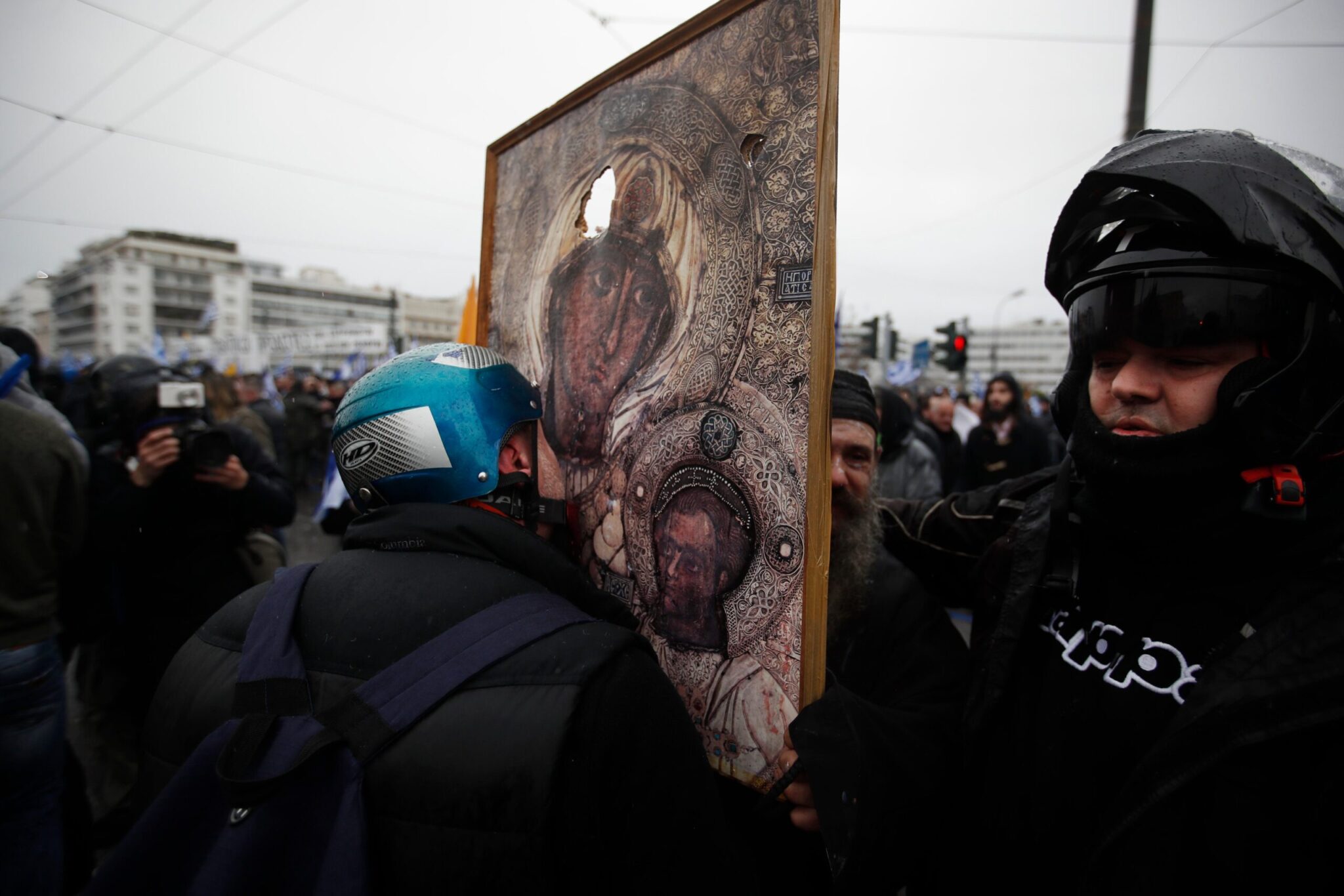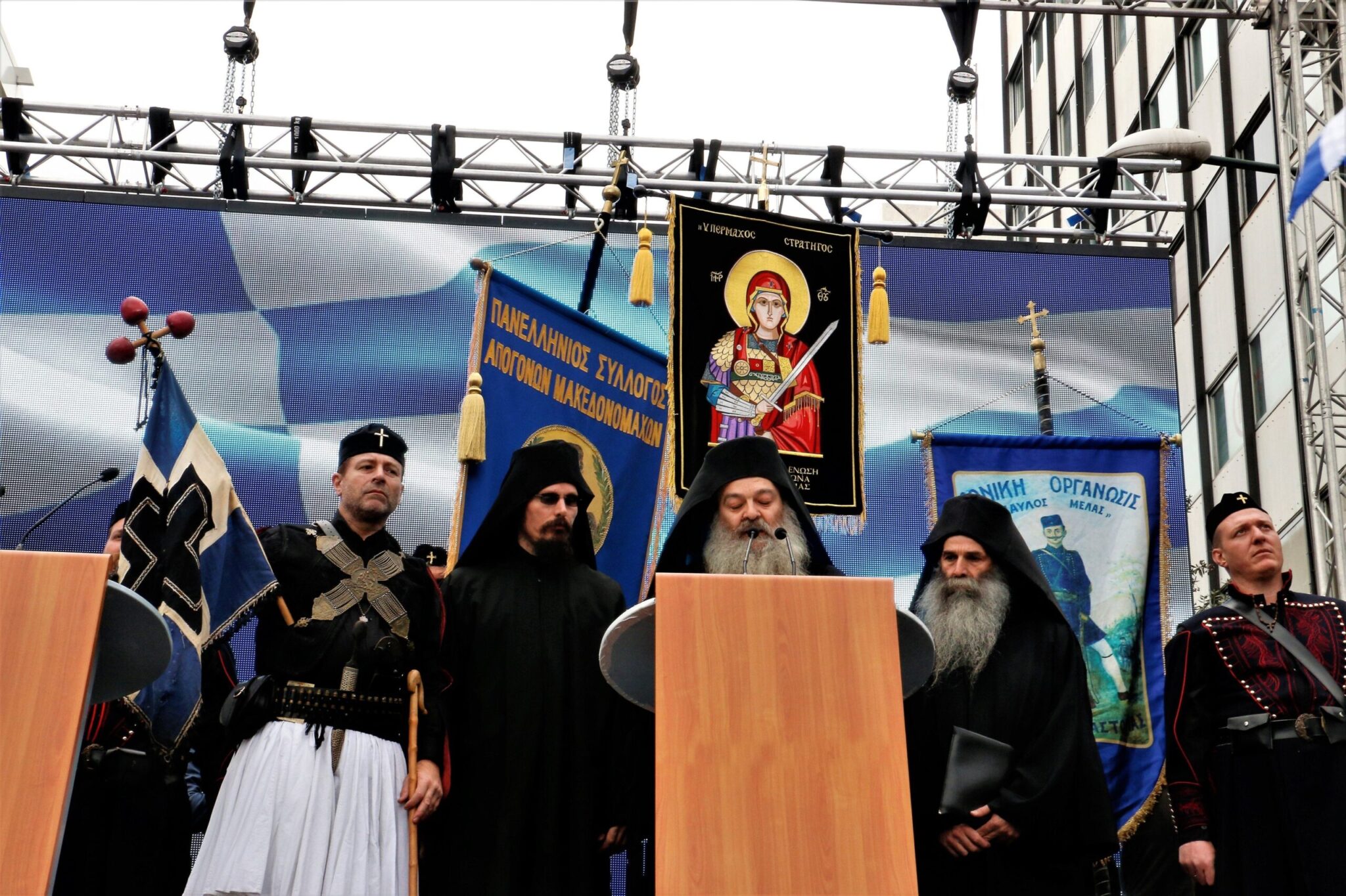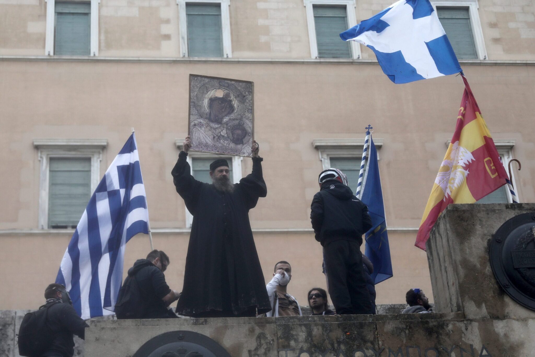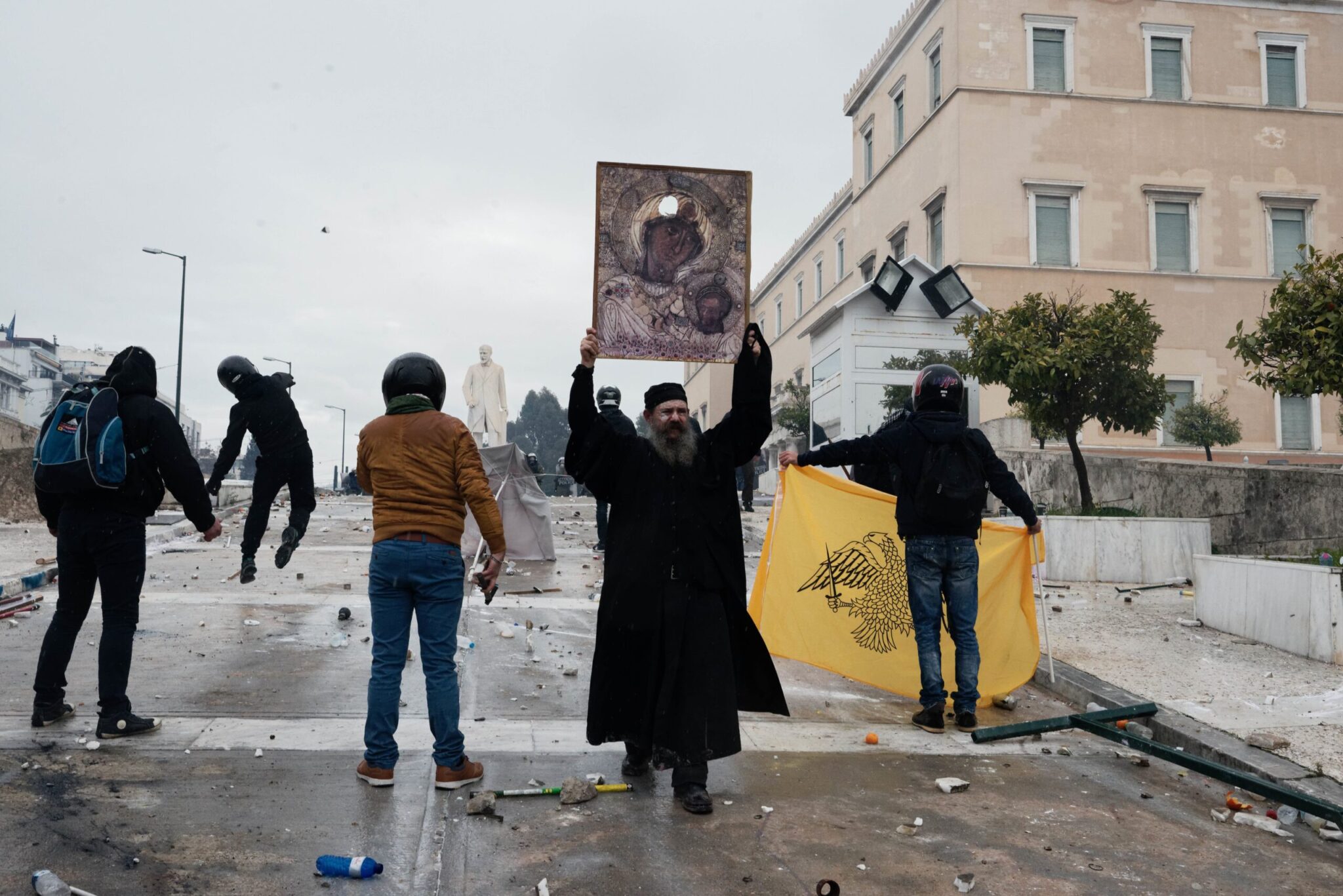 Το μεσημέρι της Κυριακής στο κέντρο της Αθήνας κυριάρχησαν αρχικά τα συνθήματα και τα πανό κατά της κυβέρνησης, και των βουλευτών με πολίτες να ανεμίζουν ελληνικές σημαίες αλλά και ιερείς που είχαν περιέφεραν βαζαντινές εικόνες – που κάποιοι μάλιστα έσπευσαν να προσκυνήσουν- αλλά και λάβαρα, εικόνες του Μεγάλου Αλεξάνδρου αλλά και της Παναγιάς.