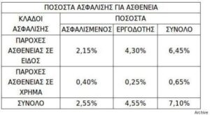 Από 01/01/2017, η ασφαλιστική εισφορά υπέρ υγειονομικής περίθαλψης των μισθωτών και λοιπών κατηγοριών που υπάγονται στον ΕΟΠΥΥ, των οποίων οι ασφαλιστικές εισφορές κλάδου σύνταξης υπολογίζονται κατά τα προβλεπόμενα του παρόντος νόμου, ορίζεται σε ποσοστό 7,10% επί των πάσης φύσεως αποδοχών και κατανέμεται κατά ποσοστό 6,45% για παροχές σε είδος, εκ του οποίου 2,15% βαρύνει τον ασφαλισμένο και 4,30% βαρύνει τον εργοδότη και ποσοστό 0,65% για παροχές σε χρήμα, εκ του οποίου 0,40% βαρύνει τον ασφαλισμένο και 0,25% βαρύνει τον εργοδότη.
